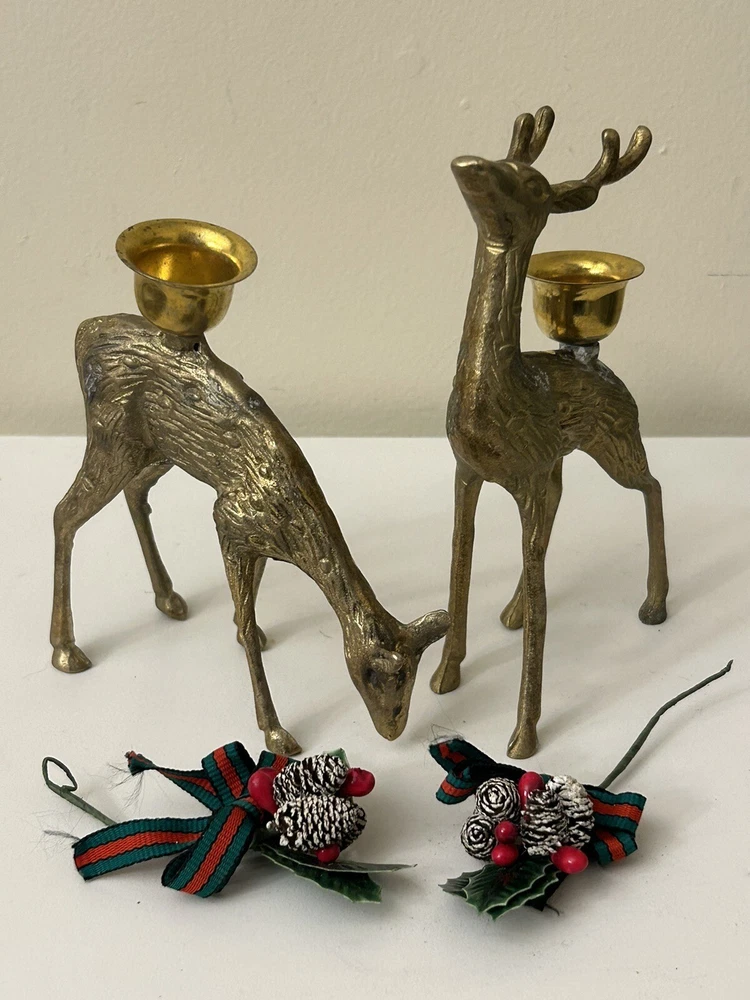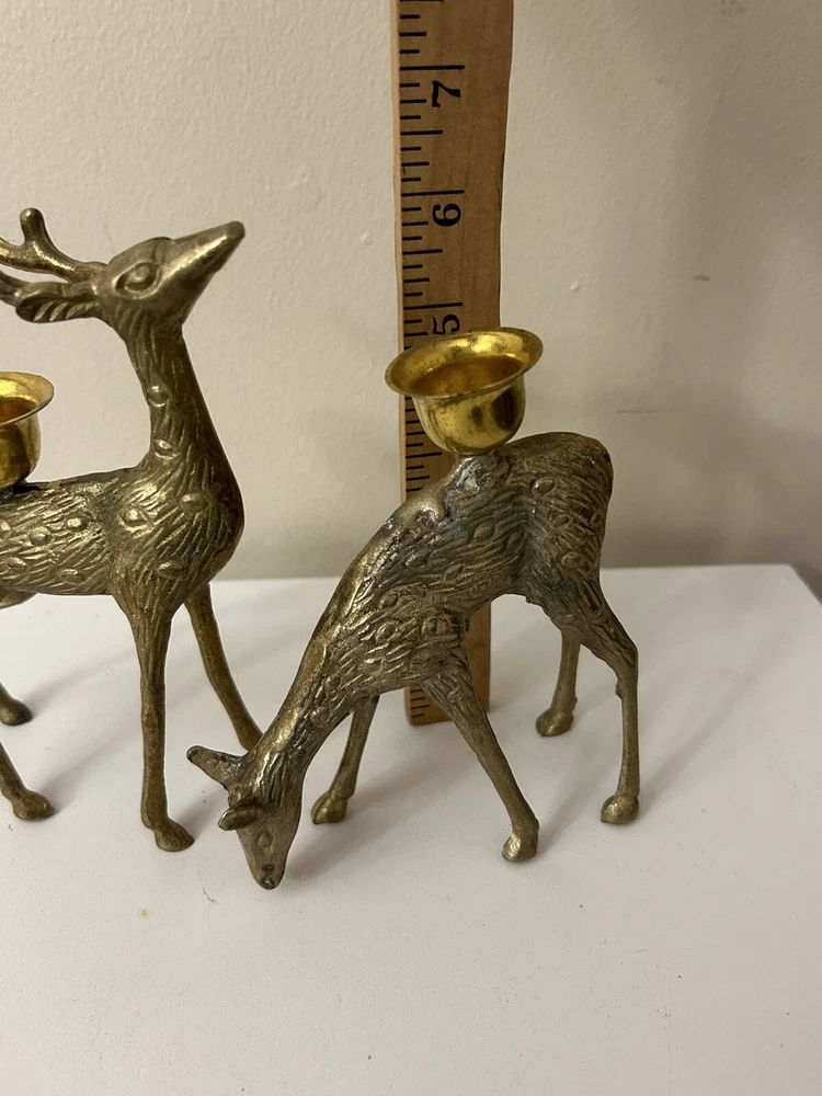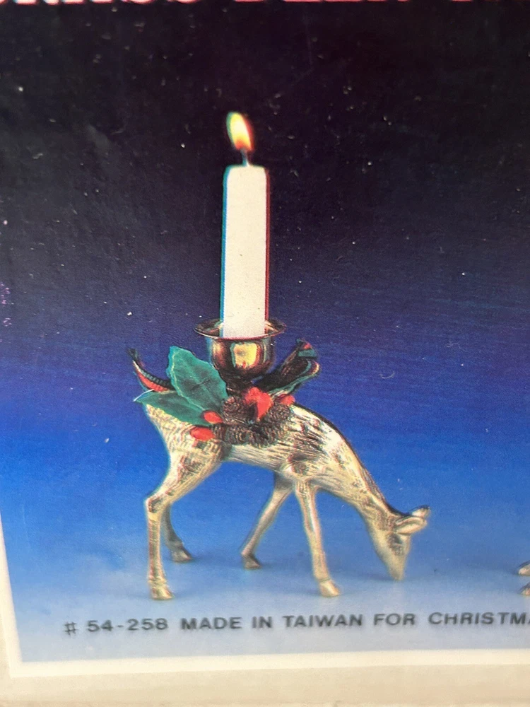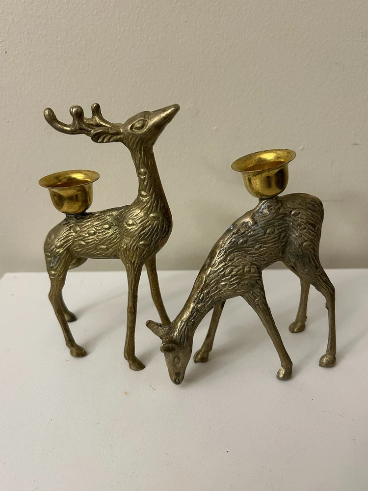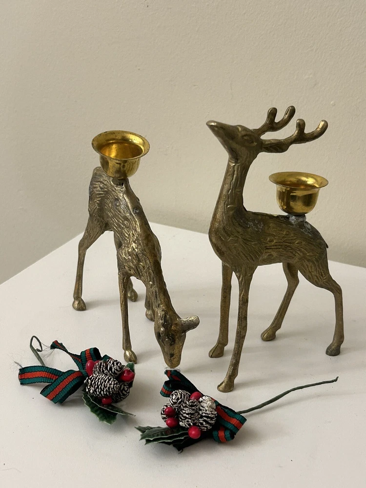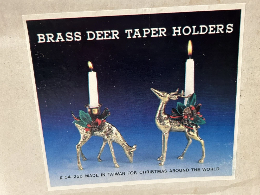 Vintage Brass Deer Reindeer Candle Holders Taper Candlestick Buck Doe Set Of 2 Christmas around the World Good vintage Condition- in original refer to pictures- minor wear to metal