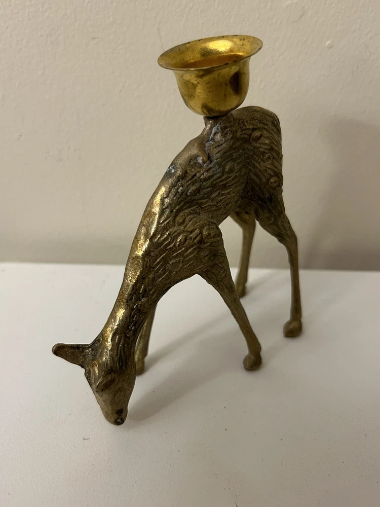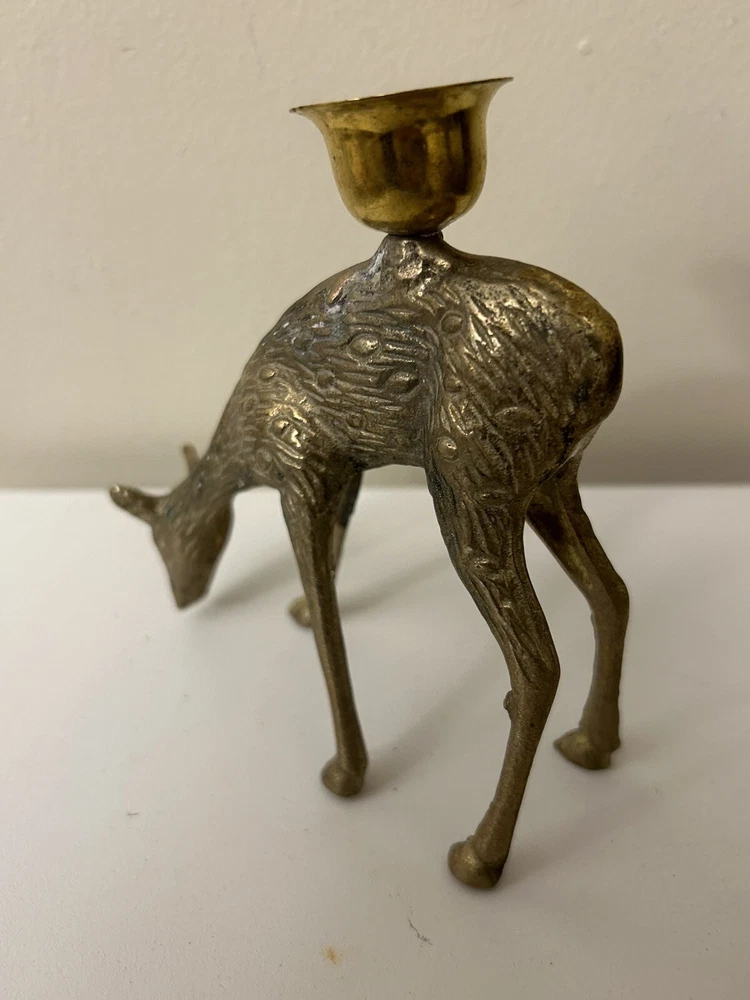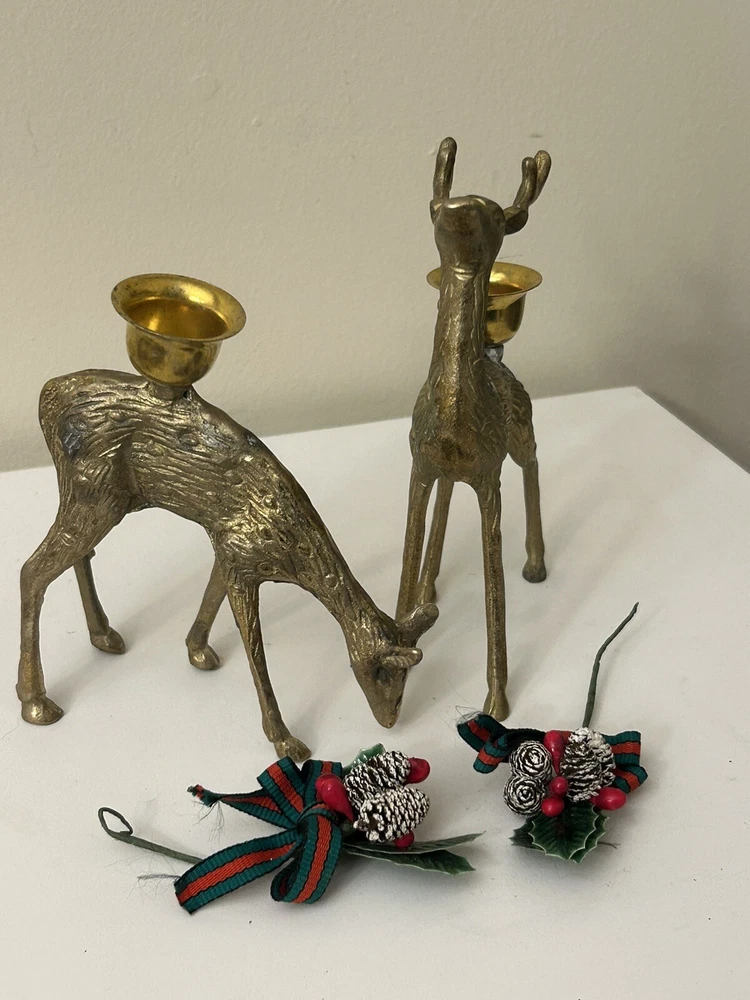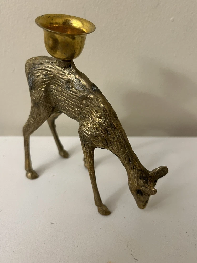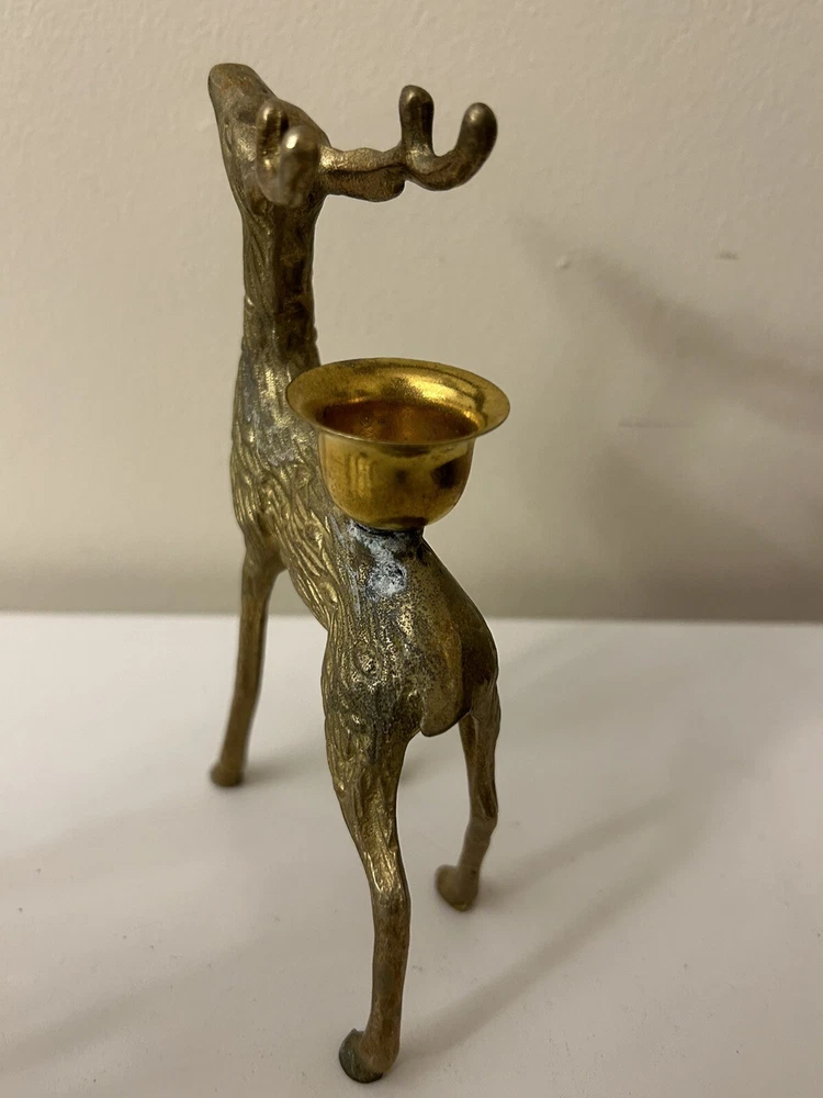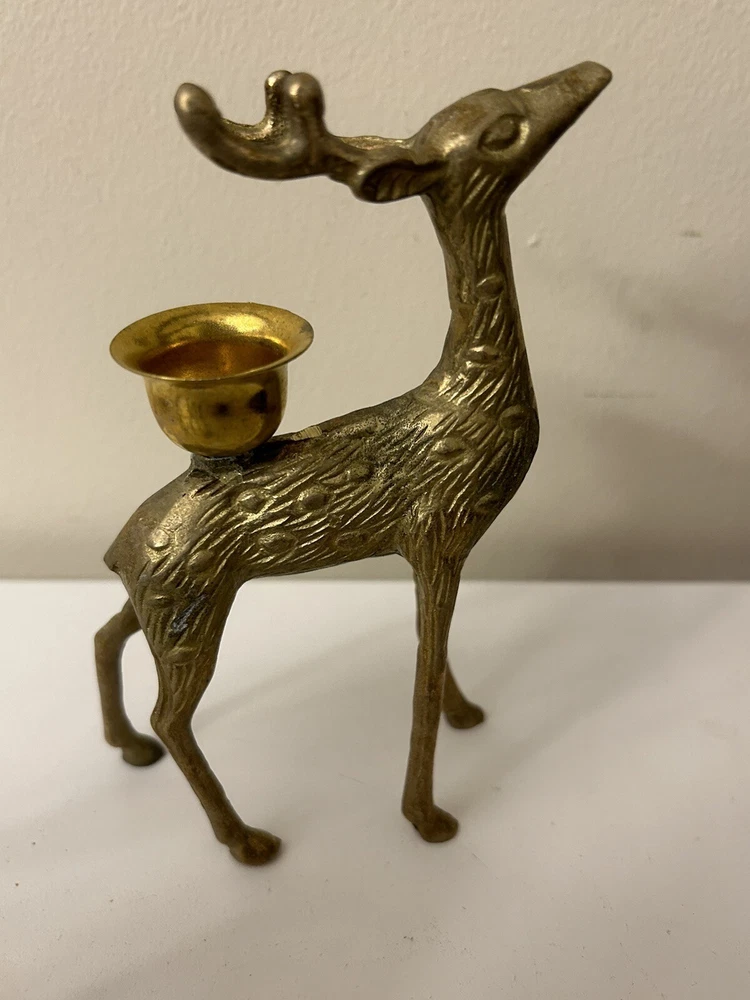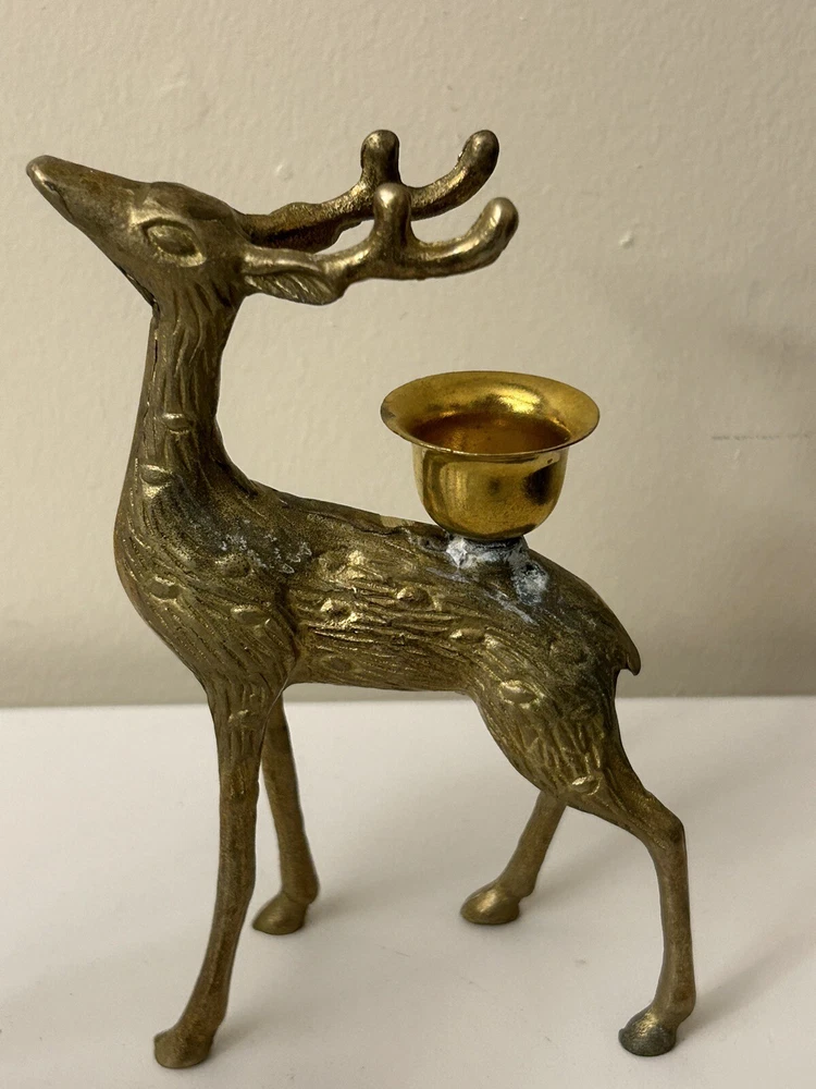 Vintage Brass Deer Reindeer Candle Holders Taper Candlestick Buck Doe Set Of 2 Christmas around the World Good vintage Condition- in original refer to pictures- minor wear to metal