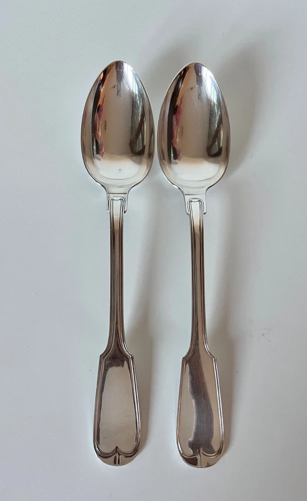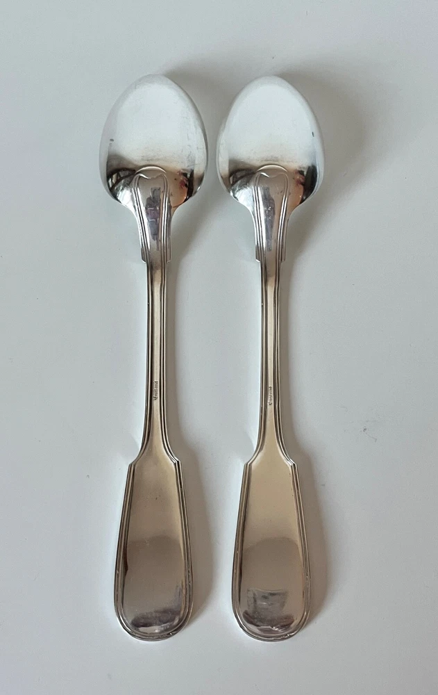 Set of 2 vintage silver plated serving spoons 11-1/4 inches long marked England, In good used condition and recently polished Please contact me if you have any questions or need more photos. Thank you