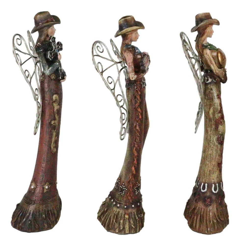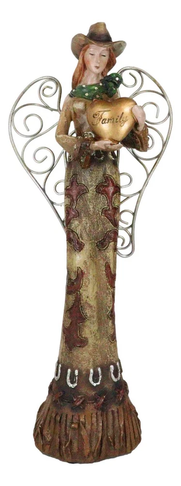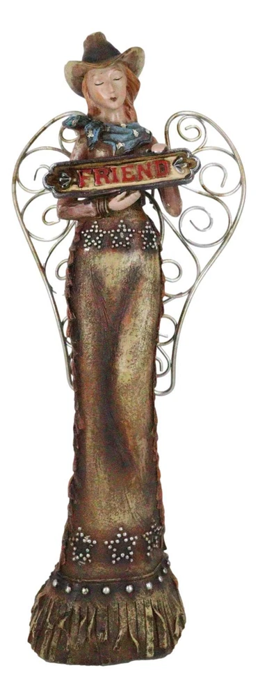 • These Cowgirl Angels each measures about 11.75" tall, 4.5" wide and 3" deep approximately. It weighs about 2.5 pounds. • These Cowgirl Angel Figurines are made of high quality designer resin, individually handpainted and polished. Because each piece is partially hand crafted, color tone may vary from pictures. • Our colorful Cowgirl Angel sculptures will create a beautiful inspirational focal point in any niche that you place them in. They are depicted in cowgirl hats and long western dresses. Each angel holds a unique article; a Cross, a plank sign that says Friend and finally a heart shaped plaque that says Family. • Props in photos are not included with the items. This listing comes as a pack of 3 angels. Ebros Set Of 3 Western Cowgirl Angels With Family Heart Cross Friend Sign Figurines Video will open in a new window Using the mobile app? Copy this link into your browser:
