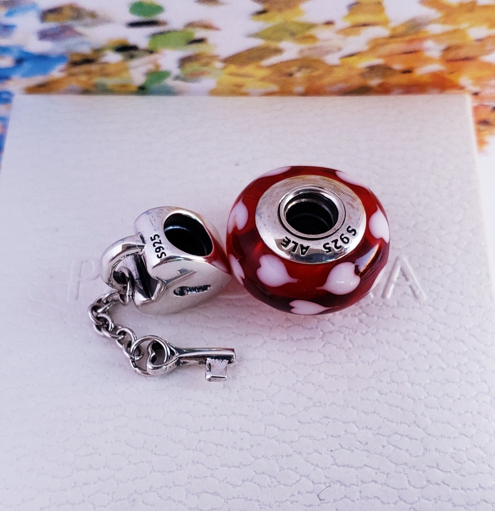 Set Of 2 New Pandora Authentic Key To My Heart and Murano Hearts Charms The charms are new, never worn. Some charms are used for pictures and advertising purposes only. All charms come in Jewelry Pouch with Pandora logo on it. Bracelet and Box NOT INCLUDED.