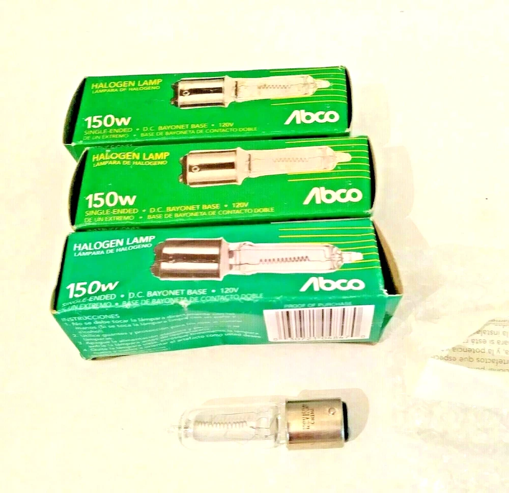 These are a SET of 3 Abco (Westinghouse) Lamp Light bulbs. 150W- Single End... . Bayonet Base.. 120V. New Old Stock. Made in 1996. Not tested.