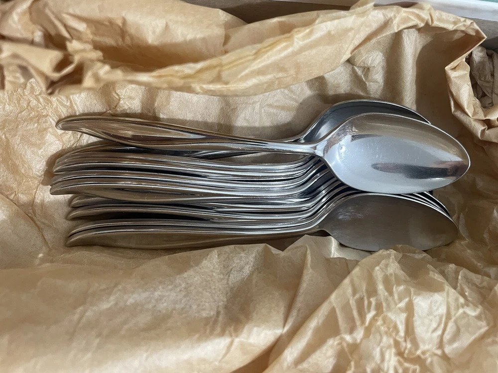 Enhance your dining experience with this stylish set of 35 Reed & Barton EVENING MOOD Stainless Flatware. Crafted from high-quality stainless steel, this set includes 3 iced tea spoons and 1 sugar spoon, making it perfect for serving guests. The solid handle pattern and glossy finish add a touch of elegance to any table setting. Ideal for adults and suitable for use in any kitchen or dining room, this set of flatware is perfect for everyday use or special occasions. It comes in a beautiful silver color and with the manufacturer color being silver, it is sure to match with any dinnerware. Upgrade your cutlery collection with this stunning set and enjoy your meals in style.