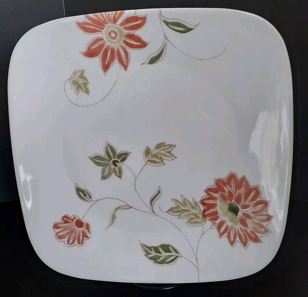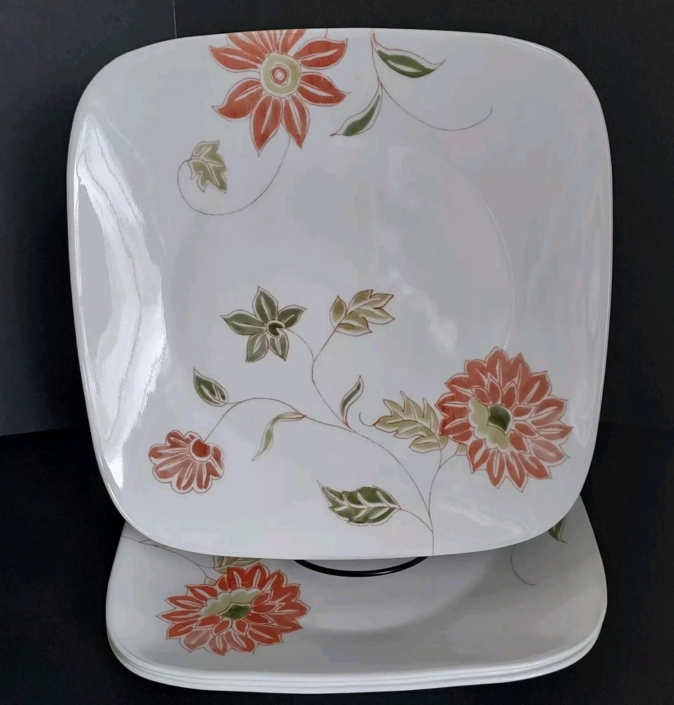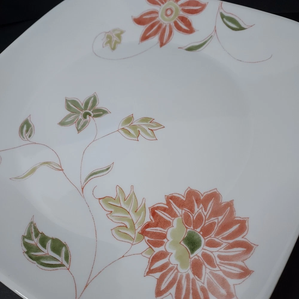 These white square dinner plates feature a fresh orange/red floral design with green and sage leaves. They were made from 2014-2019. The plates are in excellent pre-owned condition with no chips or cracks.