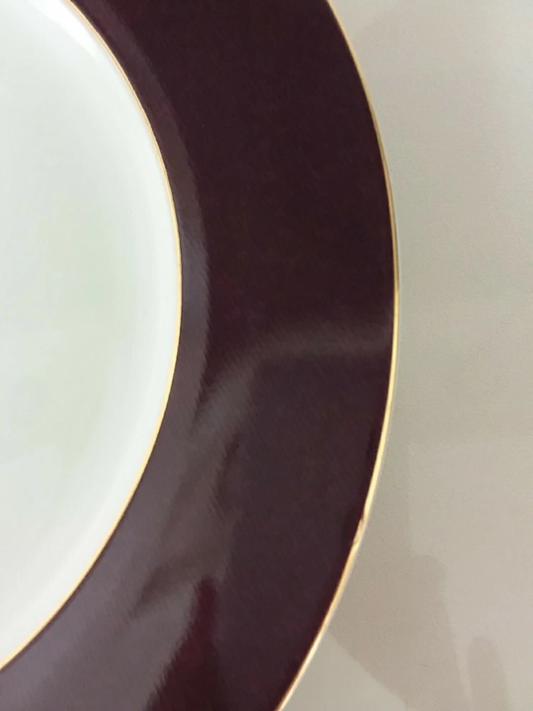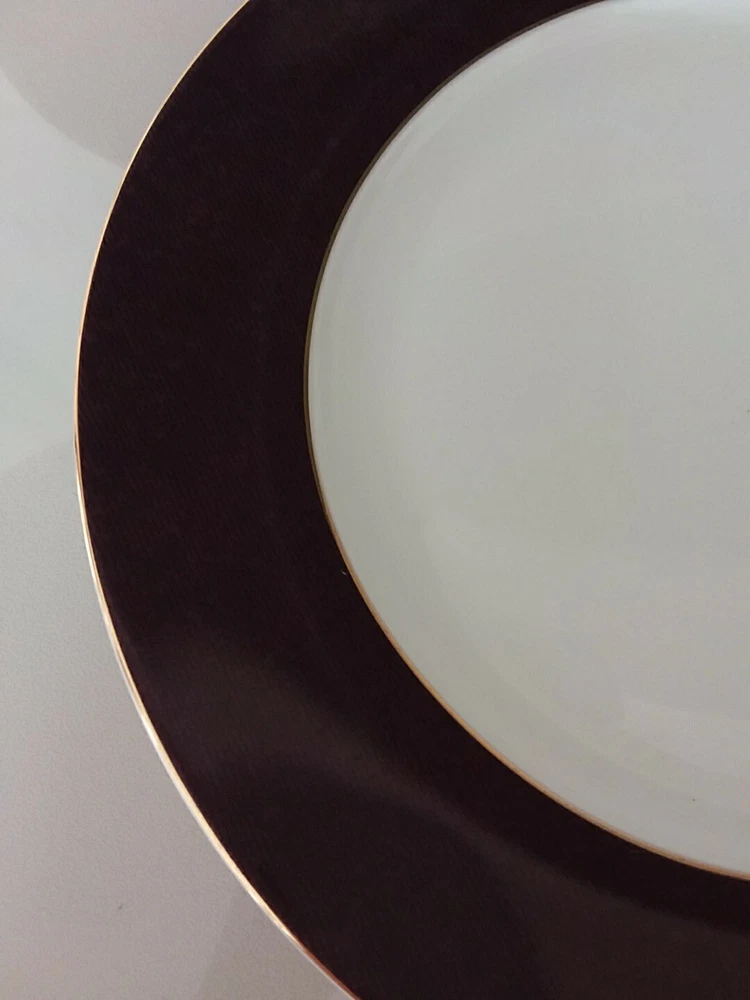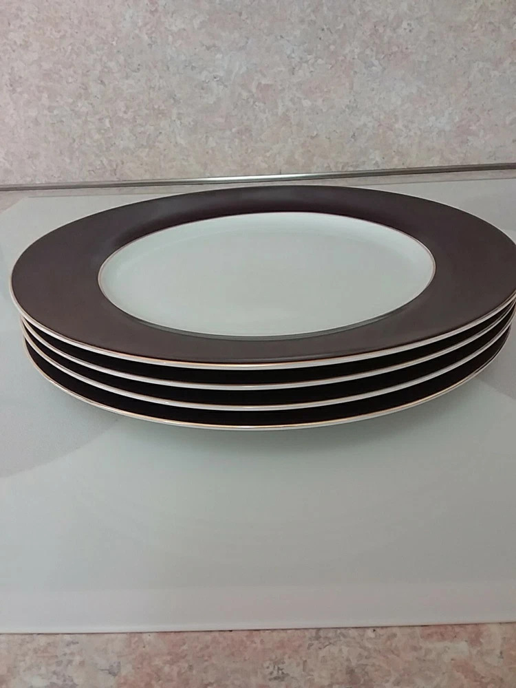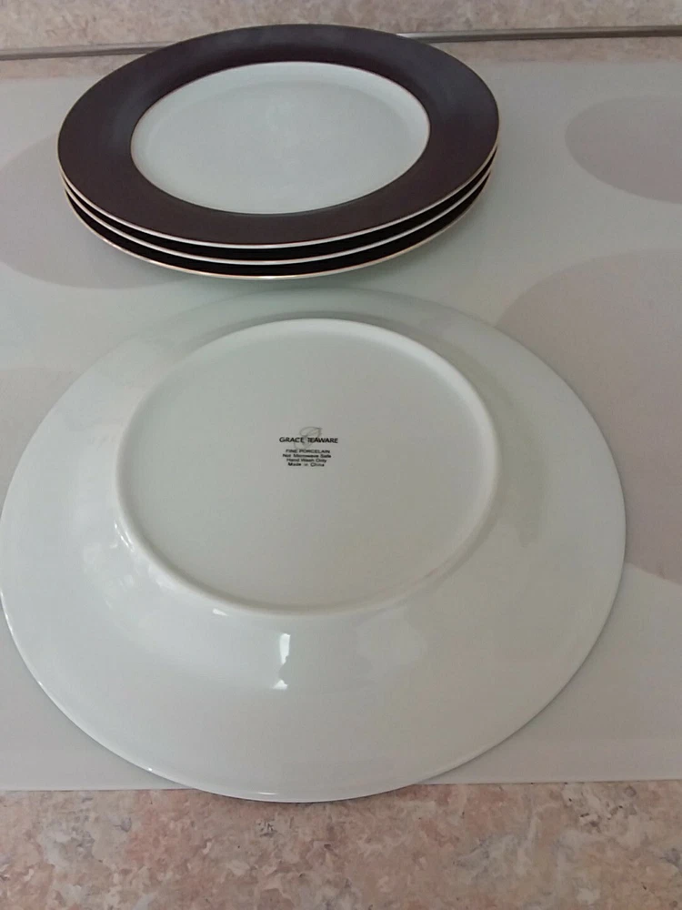 Set of 4 Graces Teaware 10 1/2" Dinner Plates, Amethyst and Gold Border Hand Wash Only Beautiful Amethyst (Deep Purple) border trimmed in Gold I also have the matching Peacock Salad Plates, item # 315571215429 A beautiful addition to your table setting I will do combined shipping if you buy any other of my other items. The bright white spots in the photos are just reflections from the lights Comes from a clean, smoke free, pet free home Buy with Confidence - see my feedback Check out my eBay store for more amazing items