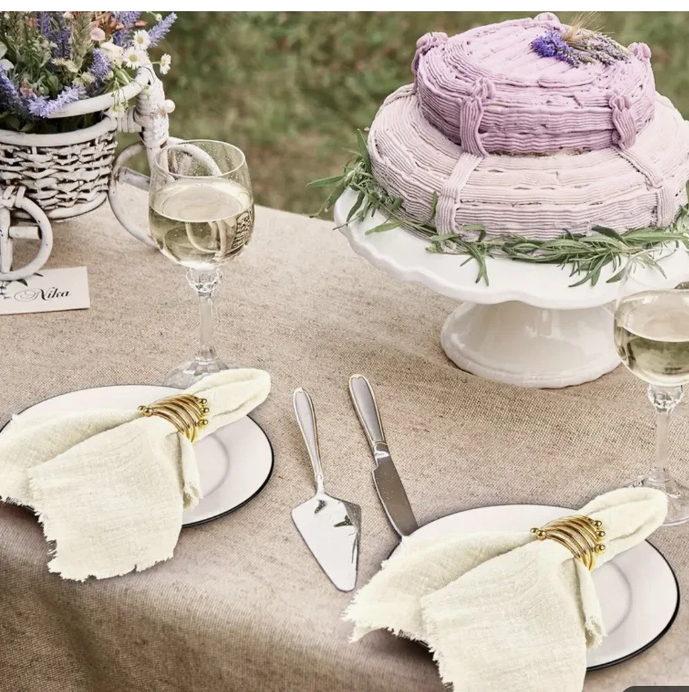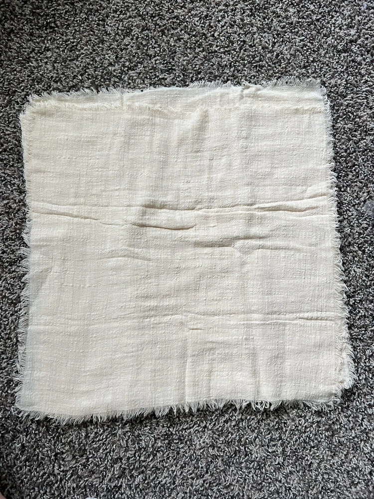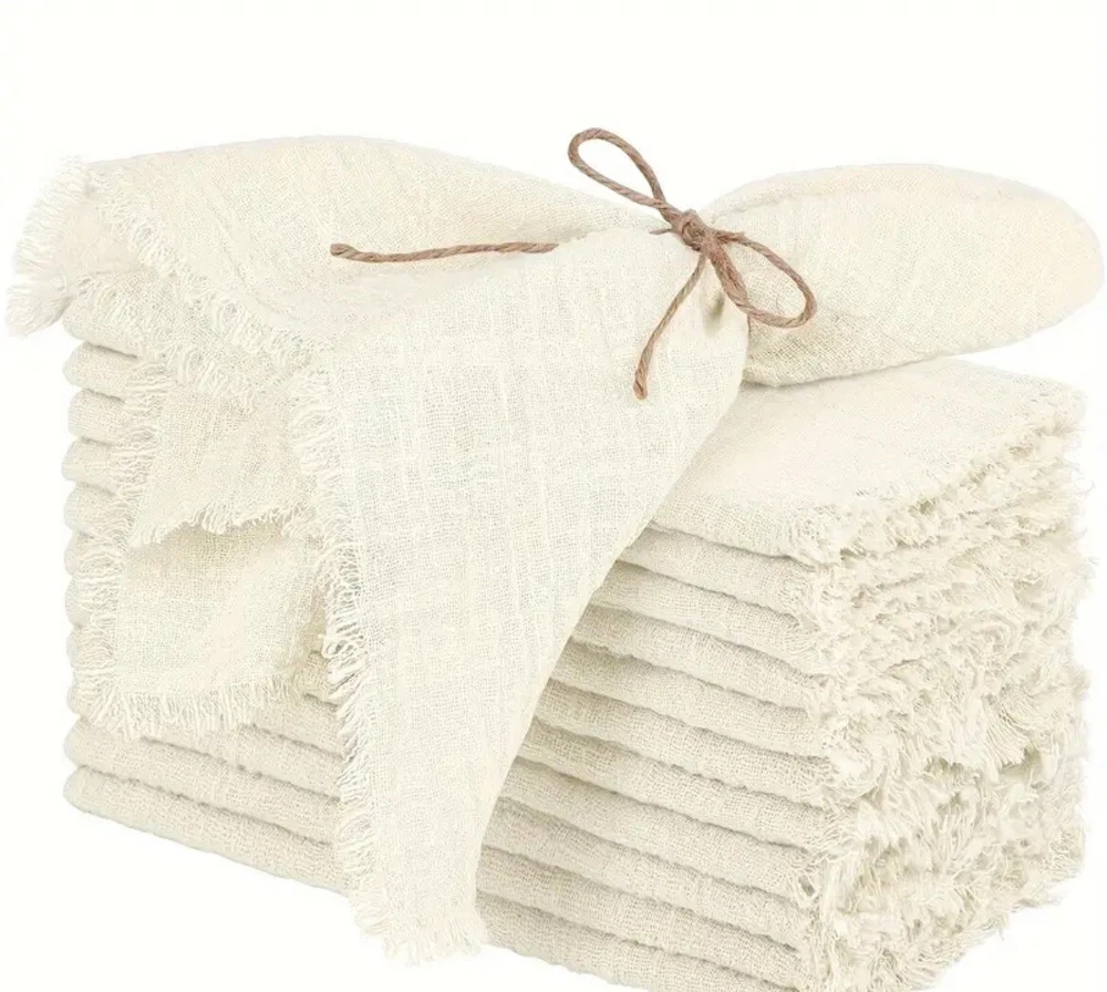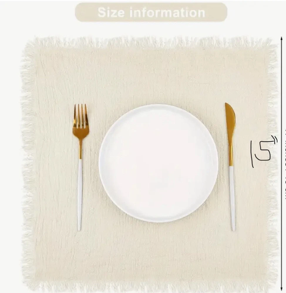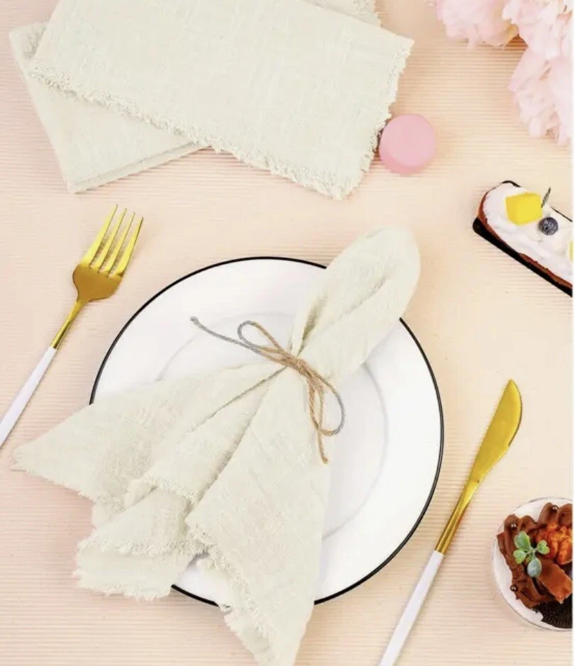 Perfect to use for a nice dinner out on the patio! Set of 6 ivory rustic boho gauze cheesecloth napkins with a nice fringe to give it a whimsical fairy or cottagecore look. Looks like something you might find at Anthropologie. Great neutral color that goes with everything, tons of cute styling options! Size is 15 inch squares Brand new in package! 6 beige cloth napkins are included, no other props from photos are included.