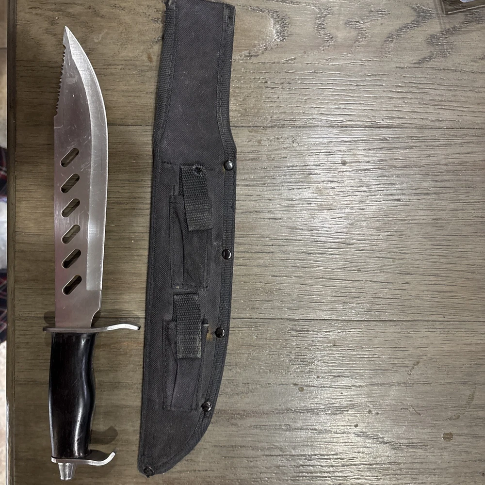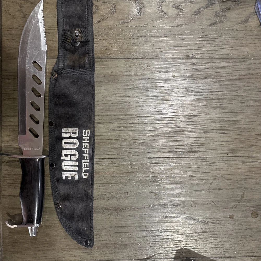 This Sheffield Rouge Fixed Blade Bowie Knife with Sheath is a must-have for any knife enthusiast. With a 9-inch stainless steel blade, this knife is perfect for hunting, combat, and survival situations. The black blade edge and ambidextrous dexterity make it suitable for both left- and right-handed users. This original vintage knife comes with a sheath, making it easy to store and transport. The combination blade edge and factory-manufactured design add to its durability and reliability. Add this Big Fighting Knife to your collection today!