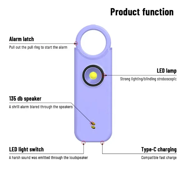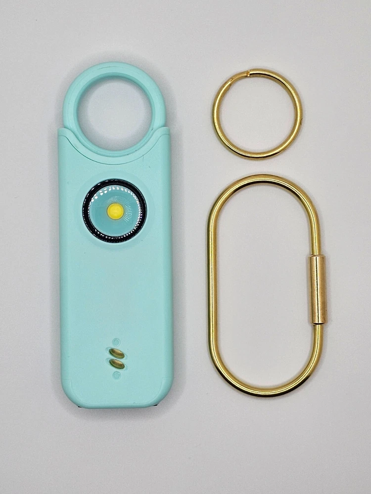 Protect yourself with this multifunctional keychain featuring a powerful 135dB siren and an LED light. Great self-defense tool for men, women, kids, students, and elderly. Deters attackers and alerts people nearby to come to your aid. Adds an extra layer of safety and security while traveling, jogging, hiking, walking the dog, etc. LIGHT: Light serves dual purposes, aiding in locating items in your purse/car or illuminating your path. Easily toggle between flashlight mode with a single click and flashing strobe light with two clicks. SIREN: Pull latch to sound alarm; light will flash at same time. Restore latch to stop alarm. Also equipped with motion-sensor mode: Press and hold LED light button for 3 seconds to activate—perfect for hanging on hotel doors—siren and light will activate upon sensoring motion. Press button again to turn off. Benefit from up to 1 hour of active alarm, 2 hours of illumination, and 3 years of standby time on the USB-C rechargeable battery. INCLUDES: USB-C Cord, Carabiner, and Key Ring.