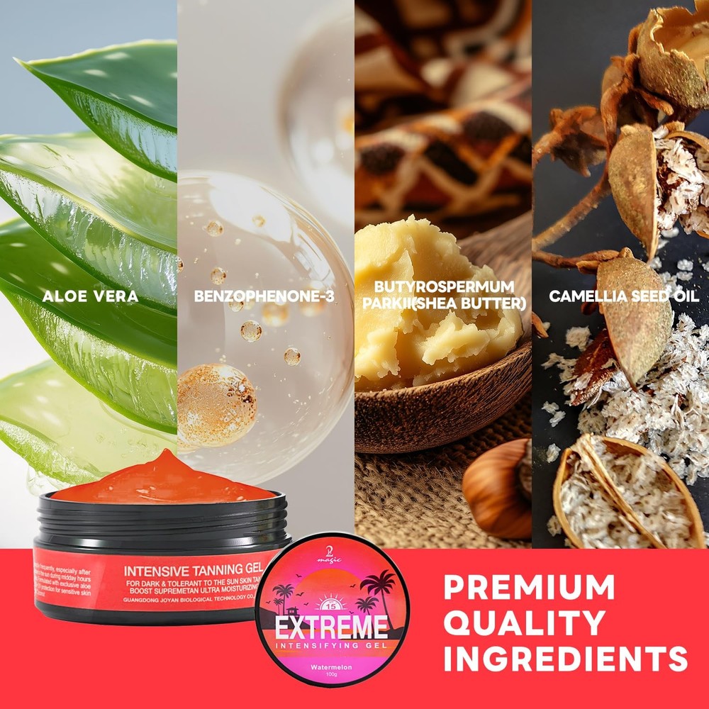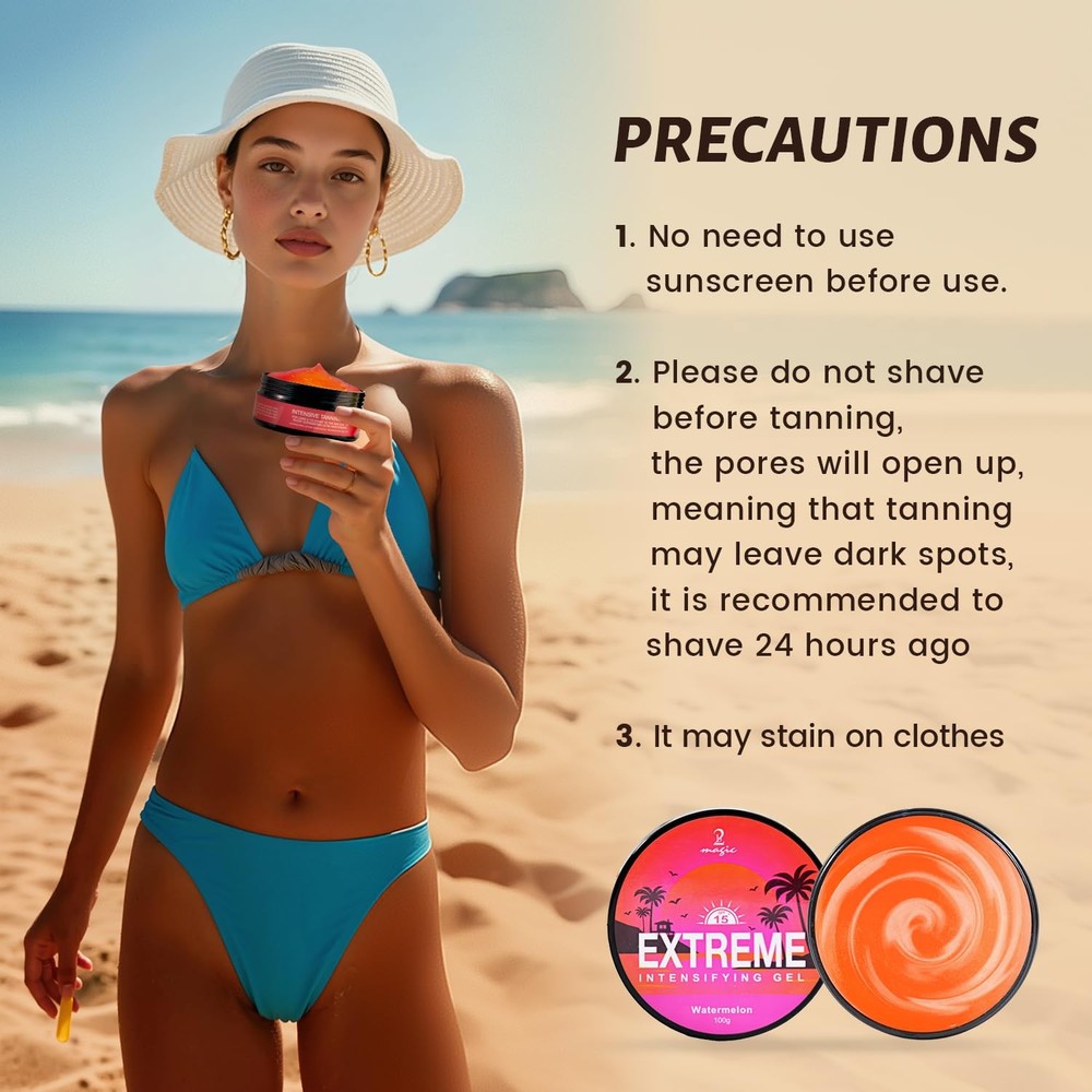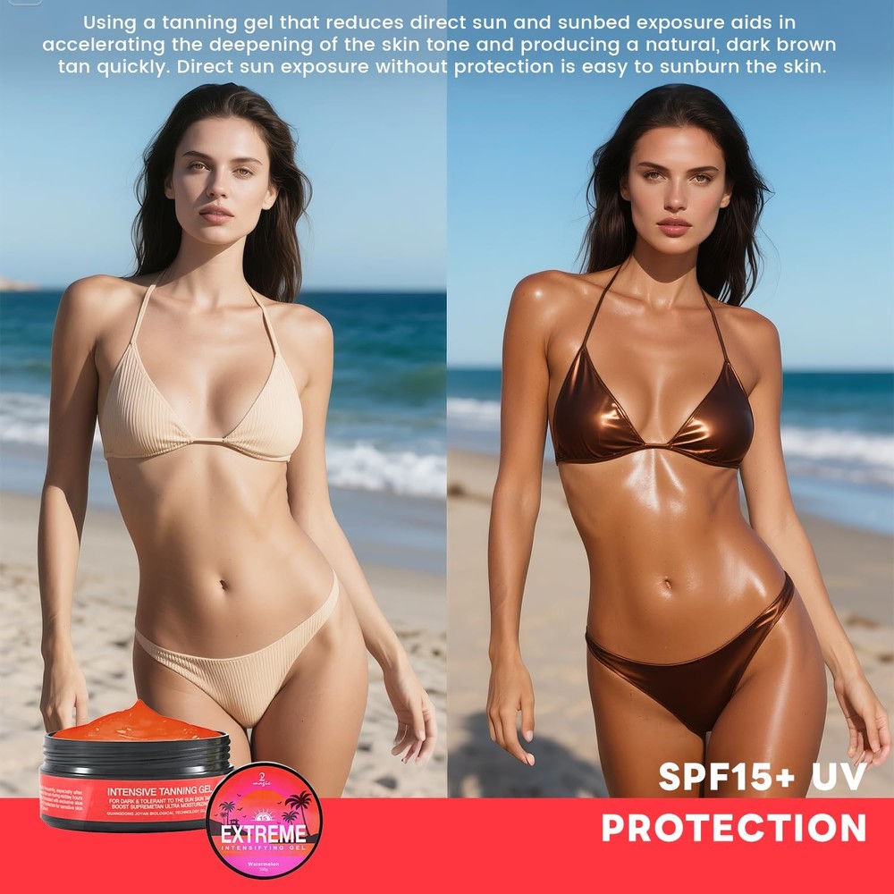 Safety Information Strictly avoid eye area. Avoid exposure to the sun during midday hours (11am-4pm). The product contains ingredients that could color fabrics. Directions Apply evenly an abundant quantity over the entire body and reapply frequently, especially after swimming, toweling & perspiring. Delicious tropical smell Watermelon, Peach and Cocount 【Intensive Tanning Gel】Get a deeper bronzed glow faster with Tanning Gel. Designed for sunbed and outdoor use, this gel accelerates melanin activation to deliver a natural, long-lasting tan while reducing UV exposure. 【Fast-absorbing Natural Tanning】Featuring a premium, exclusive aloe vera formula that provides SPF 15+ UV protection, it nourishes the skin while promoting a fast tanning process, perfect for sensitive and light skin. 【ACCELERATED TANNING TECHNOLOGY】Use our top of the line formula for fast, deep tanning. Maximizes UV efficiency! It hydrates and nourishes your skin without any harsh chemicals. Helps you achieve your ideal bronze color 40% faster than regular tanning without worrying about sunburn. 【SKIN COMPATIBILITY】Suitable for all skin types and skin tones. Evenly tints without streaking on both fair and olive skin. Ideal for tanning beginners and experienced tanners. 【After Sun Moisturizing Treatment】Dual action formula prevents dry skin after sun exposure. It is enriched with a high concentration of Aloe Vera and Shea Butter that locks in moisture for 48 hours, prolonging the longevity of your golden glow, and moisturizing, soothing and restoring your skin even after sun exposure.