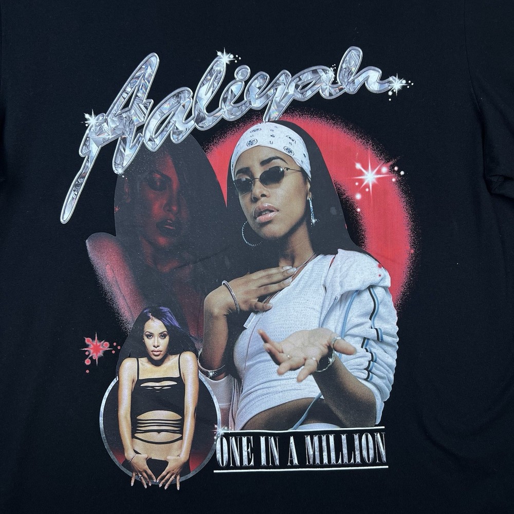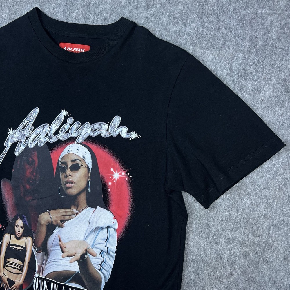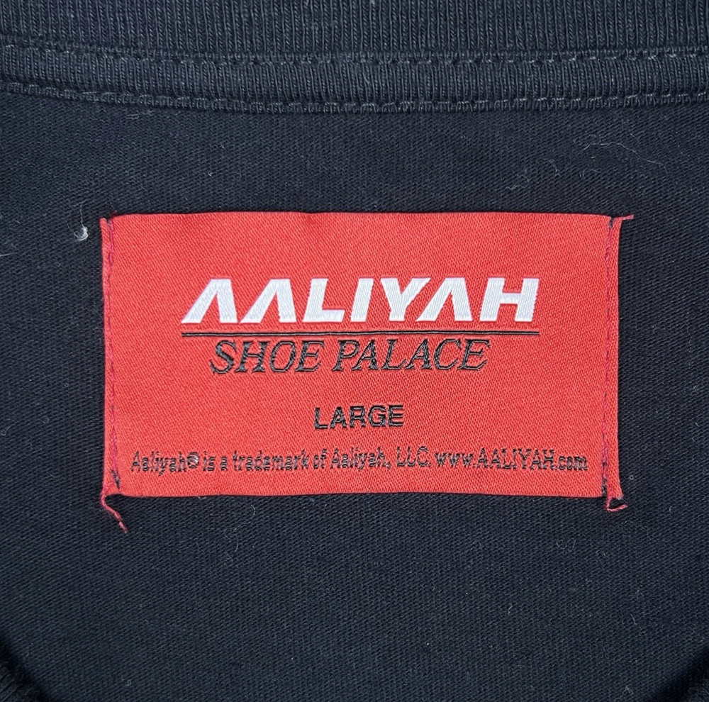 The Shoe Palace x Aaliyah One In A Million Men's Graphic T-Shirt in black, size large, features a classic crew neck and short sleeves, making it a versatile and comfortable choice for everyday wear. Made from 100% cotton knit fabric, this shirt is machine washable for easy care. The graphic print theme pays homage to music, 90s, and hip hop culture, perfect for the summer, fall, and spring seasons. This regular fit t-shirt is a stylish addition to any man's wardrobe, showcasing the collaboration between Palace and Aaliyah. Please look at listing photos and please feel free to message me if you have any questions. Ships next business day. Thank you!