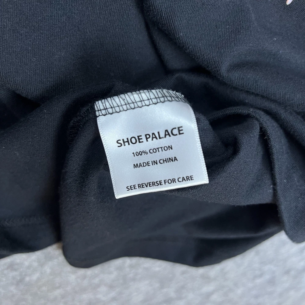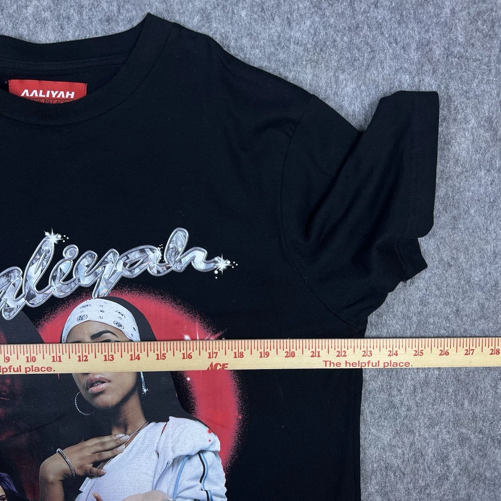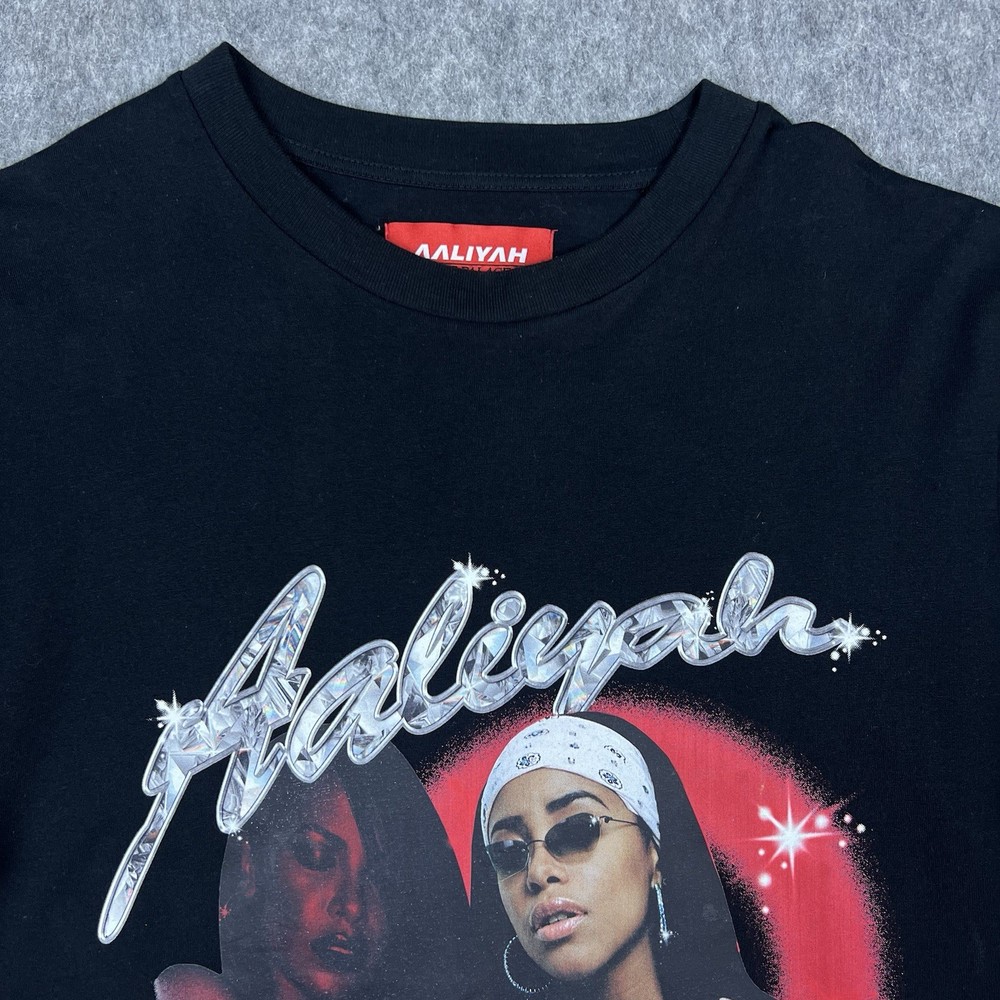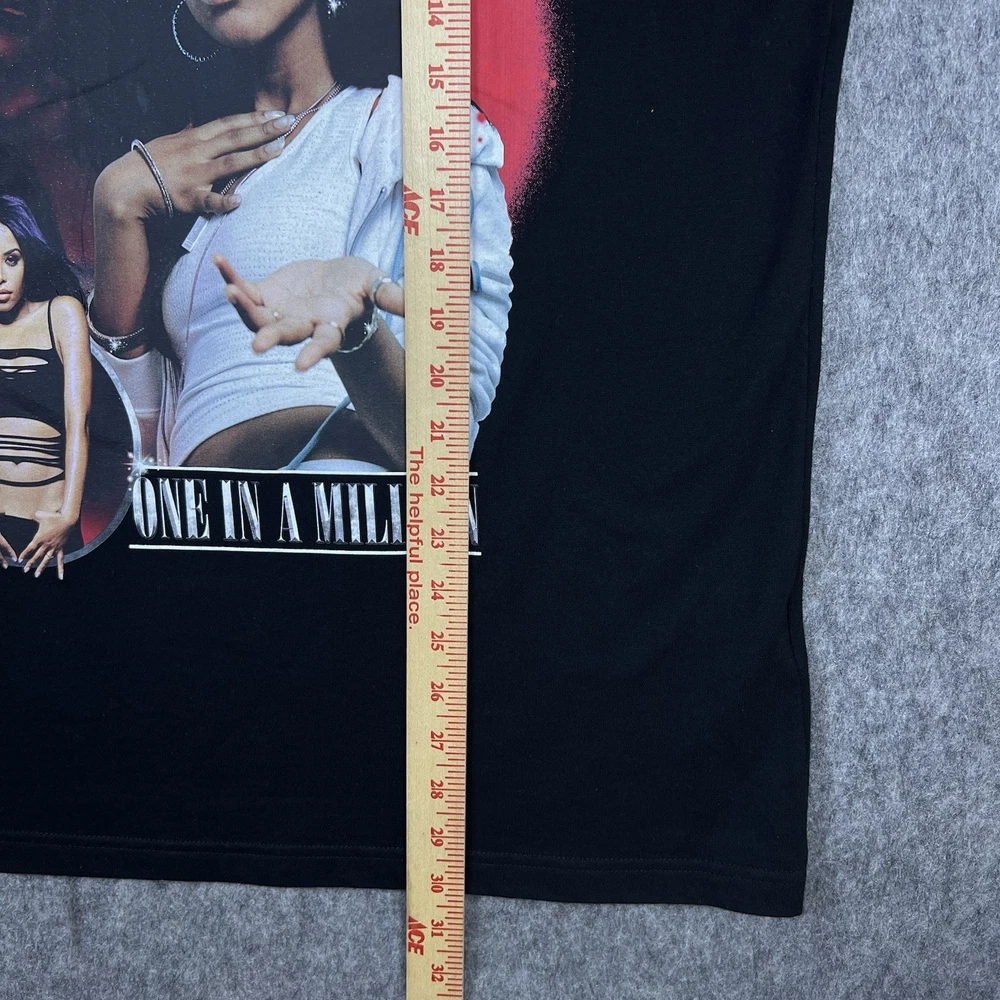 The Shoe Palace x Aaliyah One In A Million Men's Graphic T-Shirt in black, size large, features a classic crew neck and short sleeves, making it a versatile and comfortable choice for everyday wear. Made from 100% cotton knit fabric, this shirt is machine washable for easy care. The graphic print theme pays homage to music, 90s, and hip hop culture, perfect for the summer, fall, and spring seasons. This regular fit t-shirt is a stylish addition to any man's wardrobe, showcasing the collaboration between Palace and Aaliyah. Please look at listing photos and please feel free to message me if you have any questions. Ships next business day. Thank you!