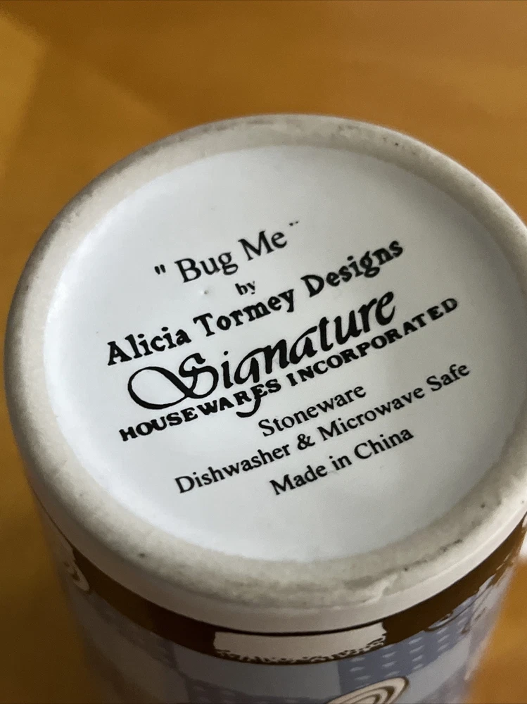 Signature Housewares “Bug Me” Mug Collection - ALICIA TORMEY designs. BUMBLEBEE. 16 Oz COFFEE MUG TEA CUP Condition is excellent. No cracks, or crazing. There is a tiny chip along rim (see photos). Really clean. (16 Oz) heavy, sturdy mugs.