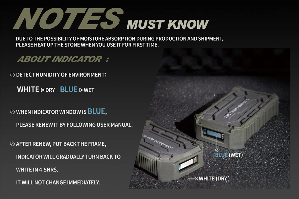 【IDEA for DEHUMIDIFY】Dehumidifier Stone, Pioneer, is an innovative product to keep gun safe. The stone absorbs moisture in the air and reduces humidity exists in your case. Protect your guns and airsoft to avoid from damp. 【HOW to USE】One piece is suitable for space up to 20L pistol cases. Effectively control the humidity to less than 60% RH. Lasts up to 4 weeks. 【EASY TO USE & ODOR-FREE】NO cables or batteries required. Perfectly replace traditional desiccant bags and beads. It will start absorbing moisture and show the humidity status with different color. 【WIRELESS & FAST RENEW】Just use microwave to heat up for 9 mins only and available to reuse again, oven is also one of the renew option. 【BEFORE YOU USED】Due to the possibility of moisture absorption during production and shipment, it is recommended to heat up the stone when indicator shows wet at first time. 【SUITABLE for CONFINED SPACE】Gun/Pistol/Rifle case, camera storage, outdoor backpacks, gym bags, instrument safe. 【PROTECTIVE & TACTICAL DESIGN】The military design of this compact dehumidifier can perfectly fit in with the case of your guns and airsoft. The protective frame can also avoid collision. 【REUSABLE & ECO-FRIENDLY】No waste or accumulation of water while dehumidifying, environmental friendly dehumidifier. With worldwide patent, our product has no leaking issue and is eco-friendly. 100% Made in Taiwan, quality guaranteed.