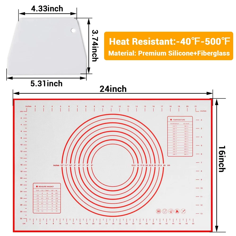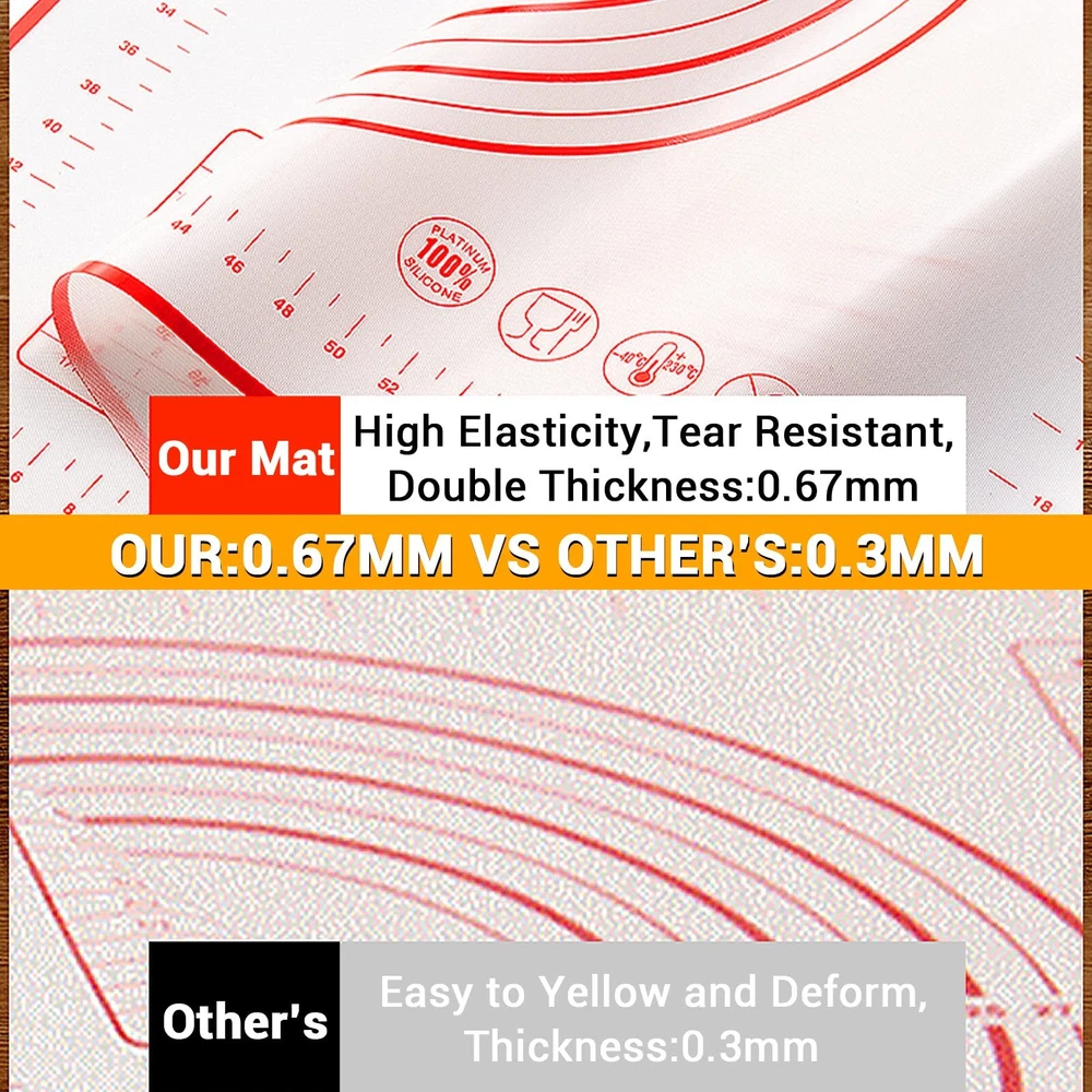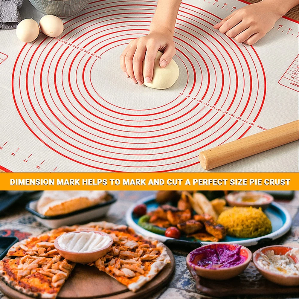 FOOD GRADE SILICONE: This silicone baking mat made of Food-Grade Silicone and glass fiber, heat resistant from -40℉ to 460℉, it is odorless/soft/durable and will not wrinkle or fade. NON-STICK & EASY to CLEAN: Non sticky surface-no need to use extra flour or oil to avoid sticking. Even if grease or dough sticks to the surface, this pastry mat can be easily cleaned with the cloth or dishwasher PERFECT SIZE BAKING MAT: This cooking mat is 16 X 24 inches, with practical conversion charts and the circular guides which make rolling out pie dough or pizza crust a breeze. Even the novice bakers can make a perfect size pie, pizza or pastry crust ANTI-SLIP BOTTOM PASTRY MAT: Double thickness(0.67mm) bottom makes this flour board strongly adhesive to any surfaces, this pie mat will not slip or crinkles. Great for kneading dough/Making Pasta/Pizza/Bread and so on EASY TO STORAGE: The soft material of this dough mat can be folded at will without creases, rolled up and folded, it is more convenient for storage, and does not take up more space unlike traditional bulky wooden pastry boards.