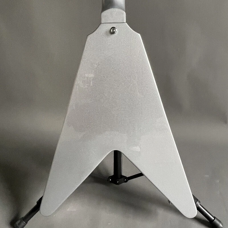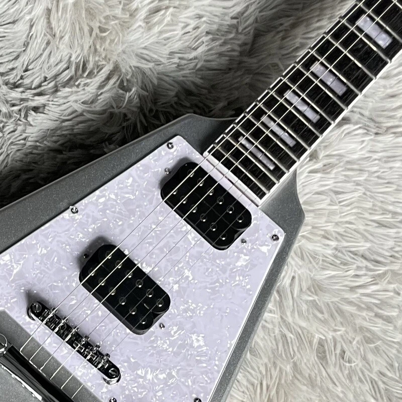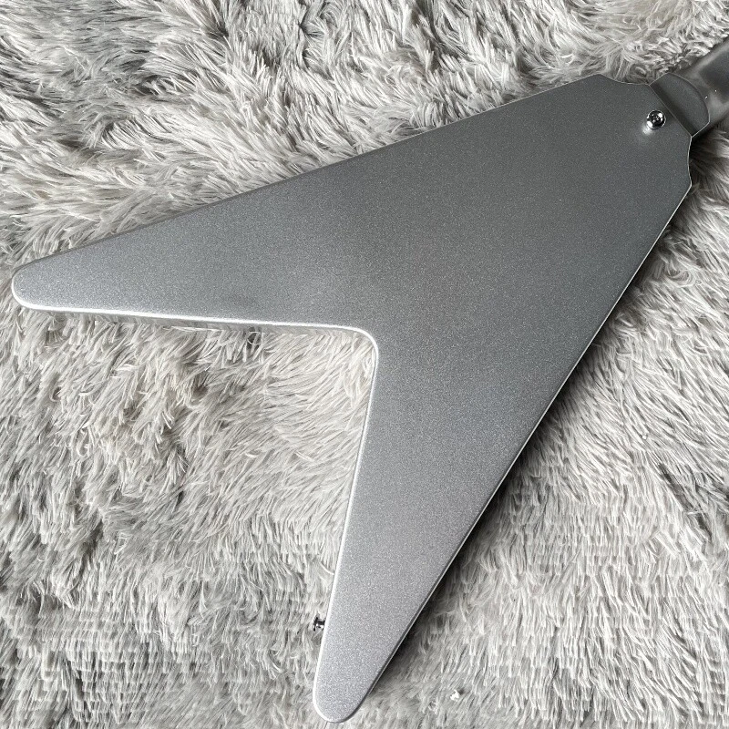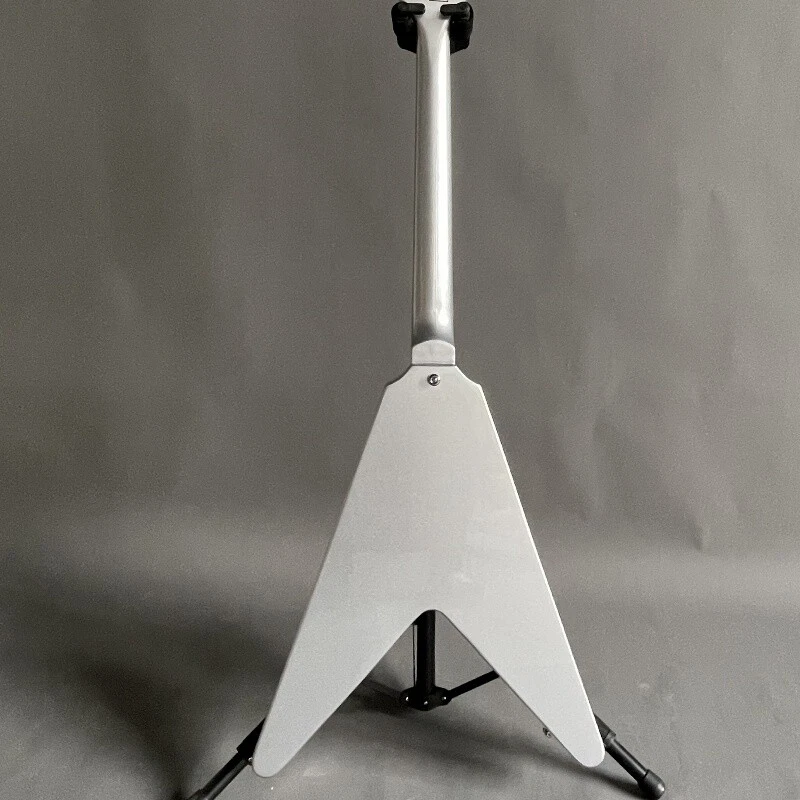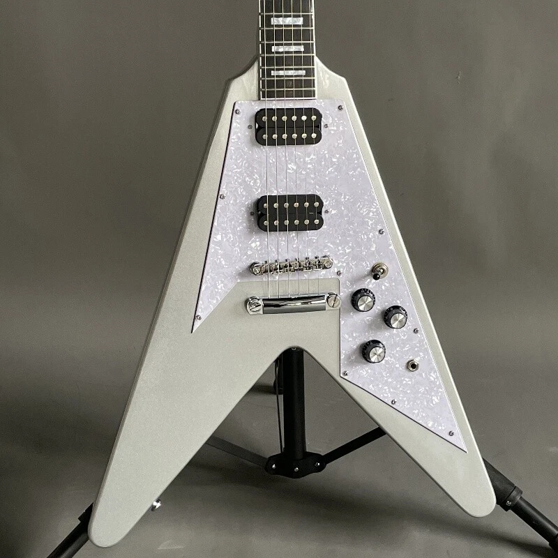 Silver Flying V Electric Guitar HH Open Pickups White Pick Guard Mahogany Body Body:mahogany Neck:mahogany Fingerboard:rosewood Joint:Bolt on Pickups:2 humbuckers Electronic:1 Volume 2 Tone Bridge:T-O-M Nut width:43 mm ABOUT THE PICTURES The pictures are taken in our factories by ourselves. Every guitar cannot be the same in 100%, the pictures of the guitar that you see is just one of them. Head stocks are not pictured per our policy.If you want some details about the guitar, please contact me. OUR GUARANTEE We test every guitar is in good condition before it is shipped out. When you receive the guitar, if you meet some problems like readjustment the strings or you are not happy with our guitar, please contact me. PACKING We will place a foam box and foam filler to prevent damage to the guitar, but if the guitar is still broken in transit, please contact me. RETURN POLICY If the item you received is broken or defective, please contact me immediately and return it within 3 days after you received it with the original or approved packaging. After we received it, we will give you a Full-Refund or Exchange. Buyers are responsible for return shopping costs. If you want to replace it, we will send a new one to you and then forward a shipping label. For missing or replacement parts(from the original order), we will ship them to you. If you have any questions about a return or exchange,please contact me. FEEDBACK The new shop is not easy to operate, if you like our guitar, truly hope you can leave a good comment. If you are not satisfied, we will do our best to solve the problem. Thank you soooo much!