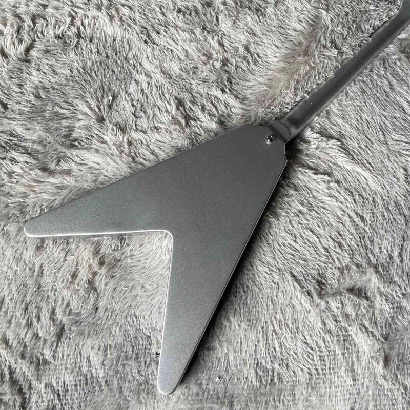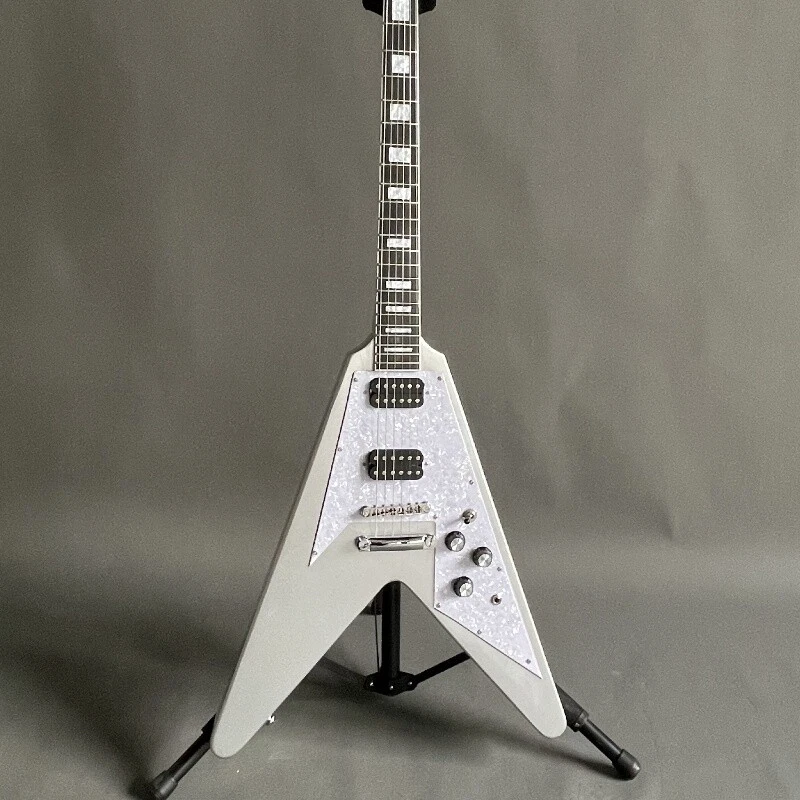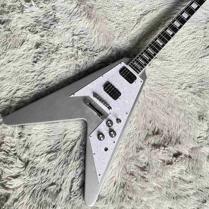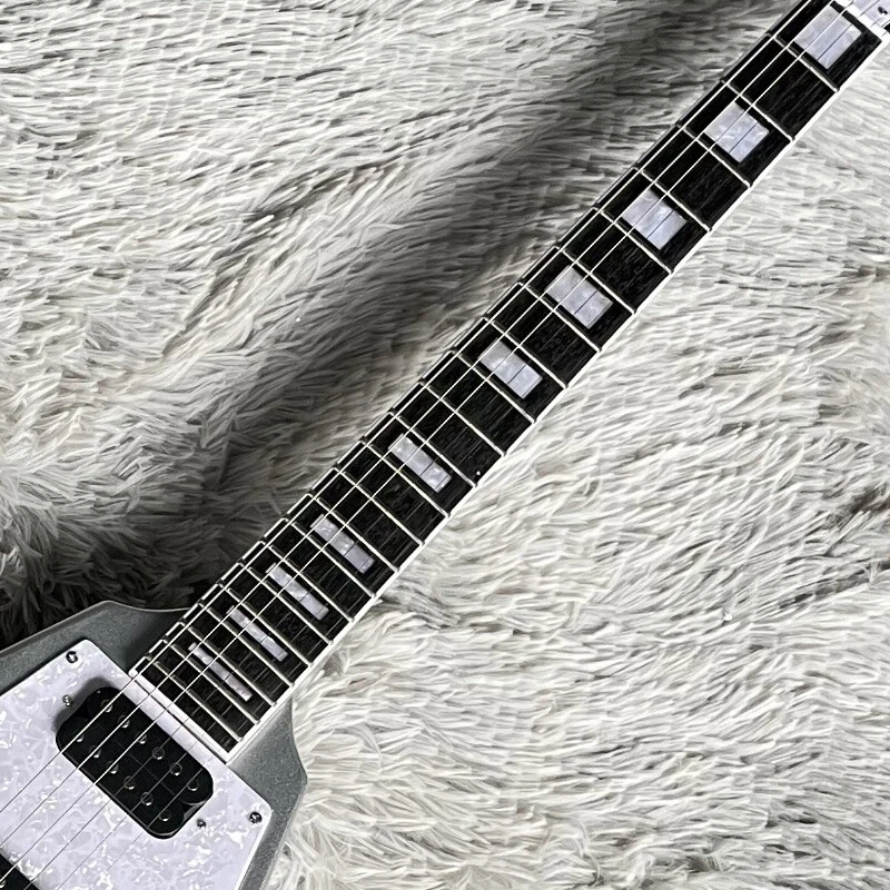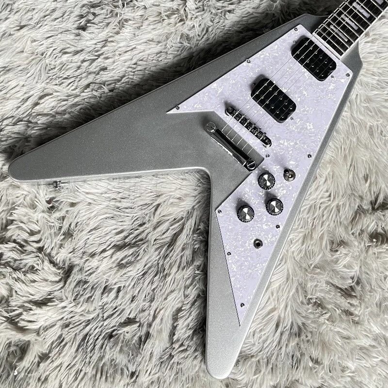 Silver Flying V Electric Guitar HH Open Pickups White Pick Guard Mahogany Body Body:mahogany Neck:mahogany Fingerboard:rosewood Joint:Bolt on Pickups:2 humbuckers Electronic:1 Volume 2 Tone Bridge:T-O-M Nut width:43 mm ABOUT THE PICTURES The pictures are taken in our factories by ourselves. Every guitar cannot be the same in 100%, the pictures of the guitar that you see is just one of them. Head stocks are not pictured per our policy.If you want some details about the guitar, please contact me. OUR GUARANTEE We test every guitar is in good condition before it is shipped out. When you receive the guitar, if you meet some problems like readjustment the strings or you are not happy with our guitar, please contact me. PACKING We will place a foam box and foam filler to prevent damage to the guitar, but if the guitar is still broken in transit, please contact me. RETURN POLICY If the item you received is broken or defective, please contact me immediately and return it within 3 days after you received it with the original or approved packaging. After we received it, we will give you a Full-Refund or Exchange. Buyers are responsible for return shopping costs. If you want to replace it, we will send a new one to you and then forward a shipping label. For missing or replacement parts(from the original order), we will ship them to you. If you have any questions about a return or exchange,please contact me. FEEDBACK The new shop is not easy to operate, if you like our guitar, truly hope you can leave a good comment. If you are not satisfied, we will do our best to solve the problem. Thank you soooo much!