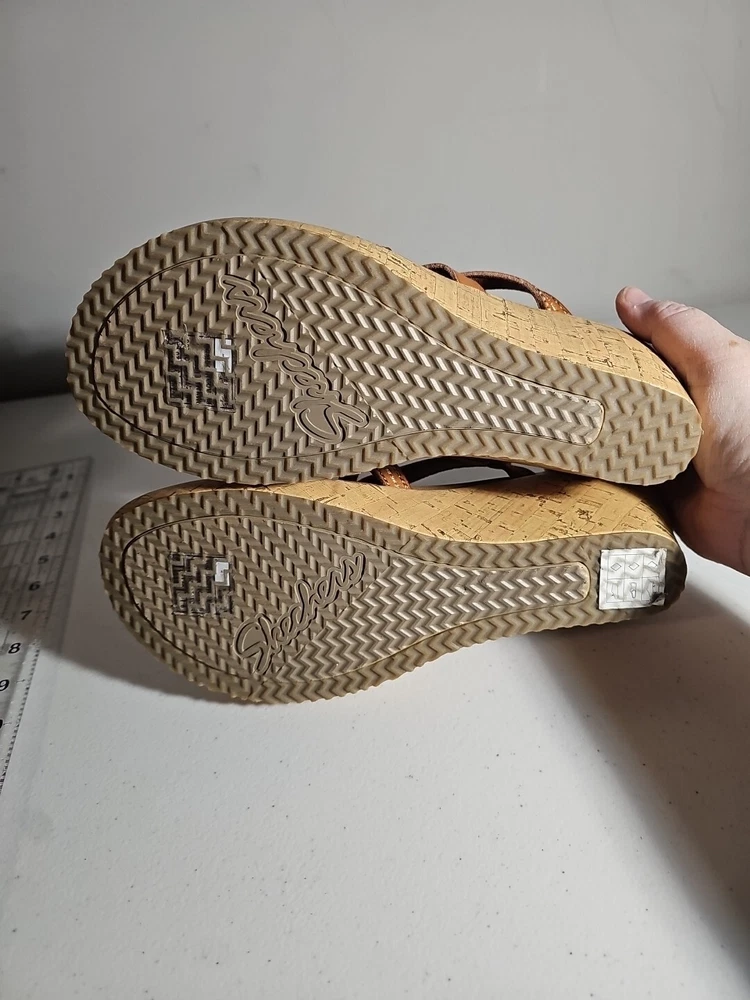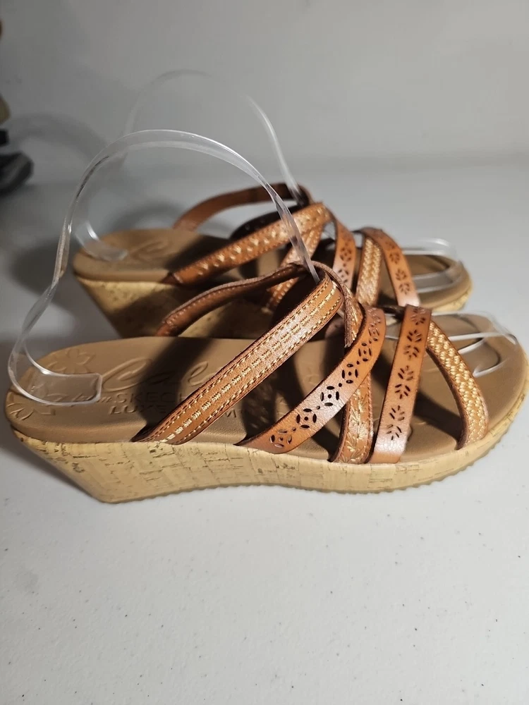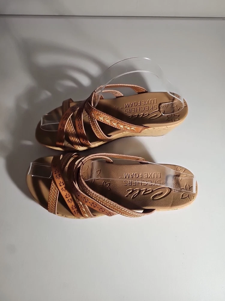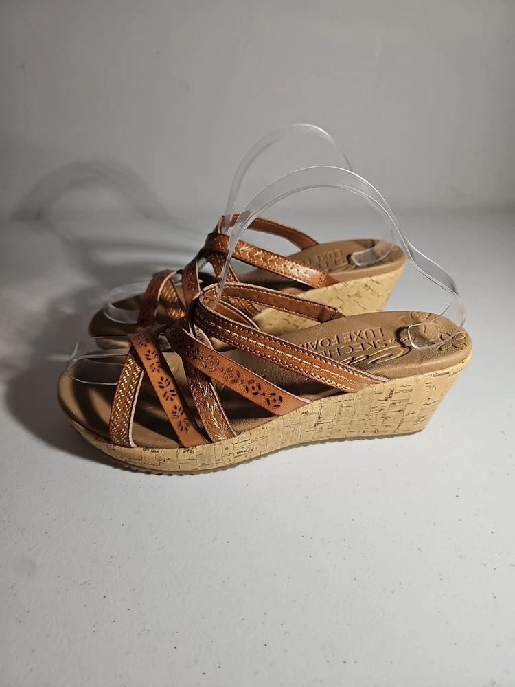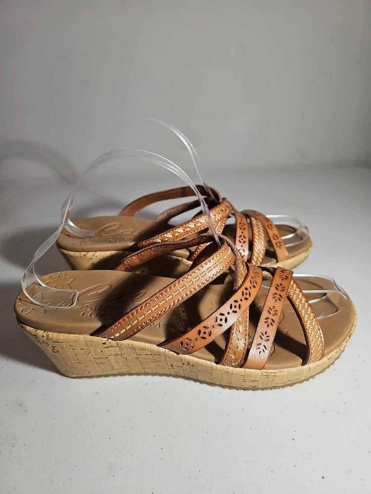 Elevate your casual comfort with these Skechers Beverlee Tiger Posse Wedge Slide Strappy Sandals in Women's Size 9. These sandals feature a slip-on closure and adjustable strap for a secure fit. The rubber outsole provides traction and durability, while the cushioned insole offers comfort and support. With a solid pattern and brown color, these sandals are perfect for summer, fall, and spring. The faux leather lining material and manmade upper material add to the durability and comfort. The Skechers Beverlee product line is known for its strappy design and casual comfort, making these sandals a great addition to any wardrobe. Super cute, worn once;)