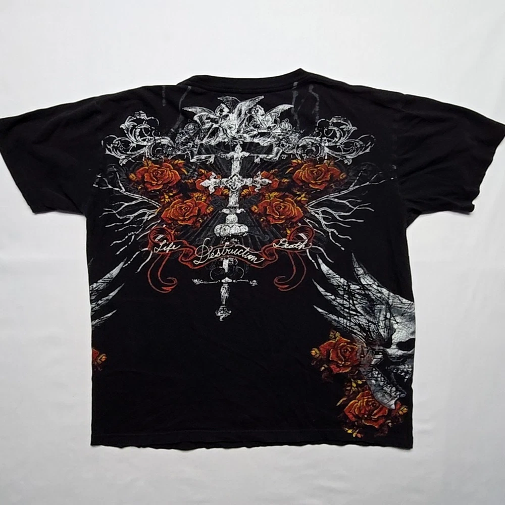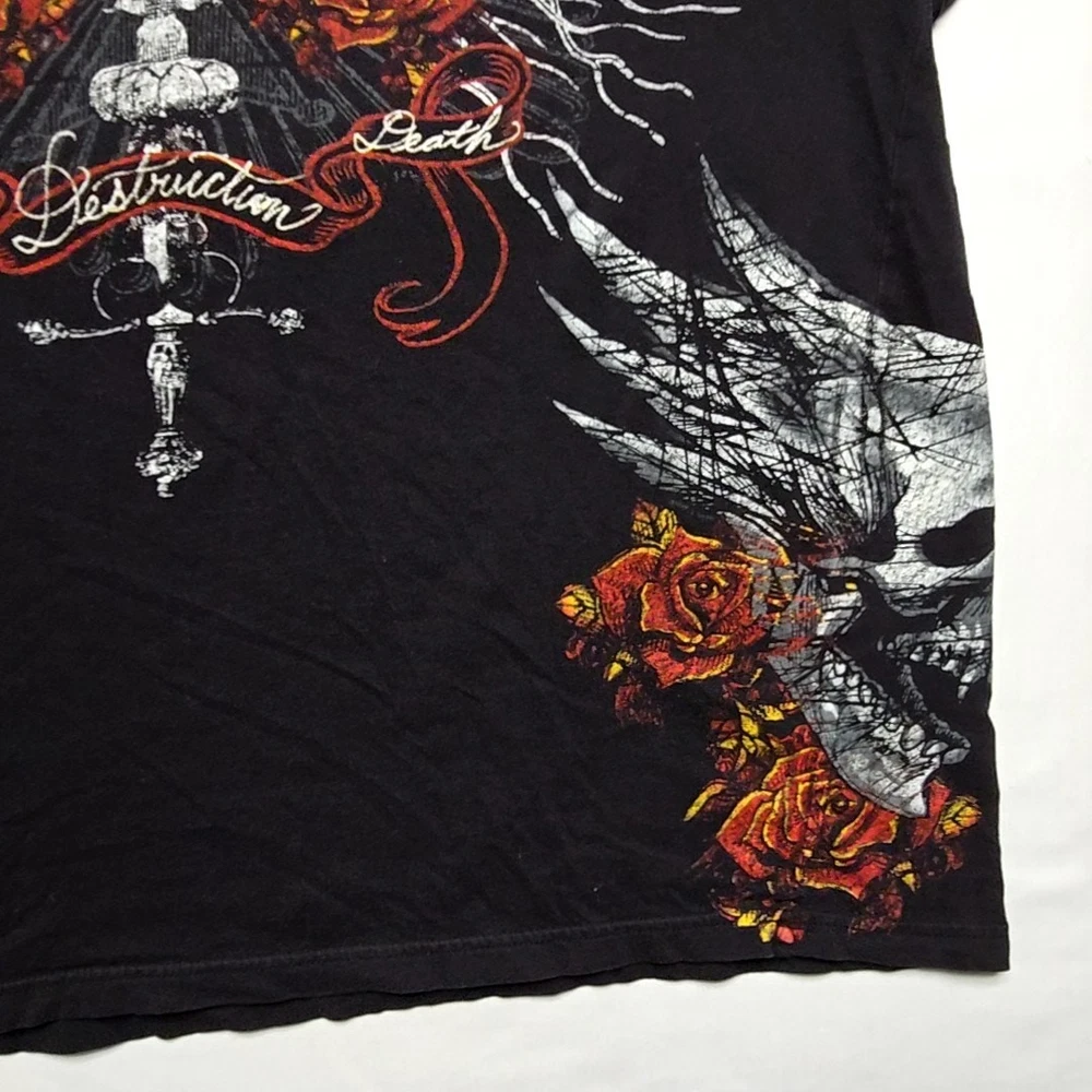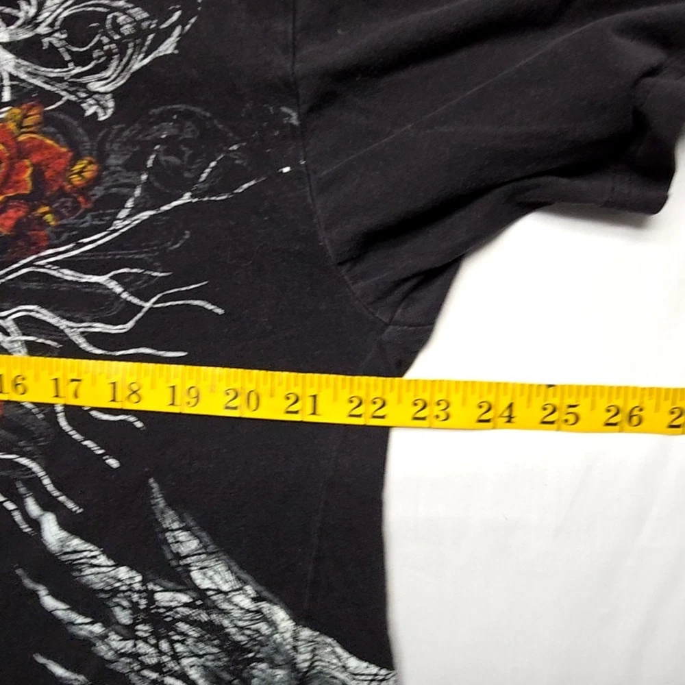 Skull Wings Gothic Graphic Tee Red Tattoo Affliction Style Y2K Large Shirt Brand: Hyperion Size: Large Color: Black with graphic print Material: 100% Cotton Fit: Regular Condition: No visible holes or stains. Review photos for details. Offers & Bundles: I'm open to offers and can bundle items together for you. Shipping: All orders are shipped within the same or next business day. Inquiries & Issues: If you have any questions or issues, feel free to reach out. I post over 40 new items daily. Measurements: - Chest: 22.5 in - Length: 25.5 in