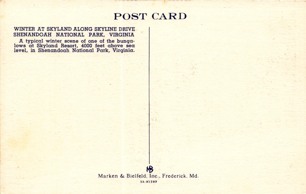 MAKE AN OFFER. THE MORE YOU BUY THE BETTER DEAL I WILL ACCEPT This postcard showcases a winter scene at Skyland Resort, located along Skyline Drive in Shenandoah National Park, Virginia. Skyland Resort is situated at an elevation of 4000 feet above sea level, providing stunning views of the surrounding landscape. The postcard features one of the bungalows at Skyland Resort, highlighting the picturesque winter setting in the park.