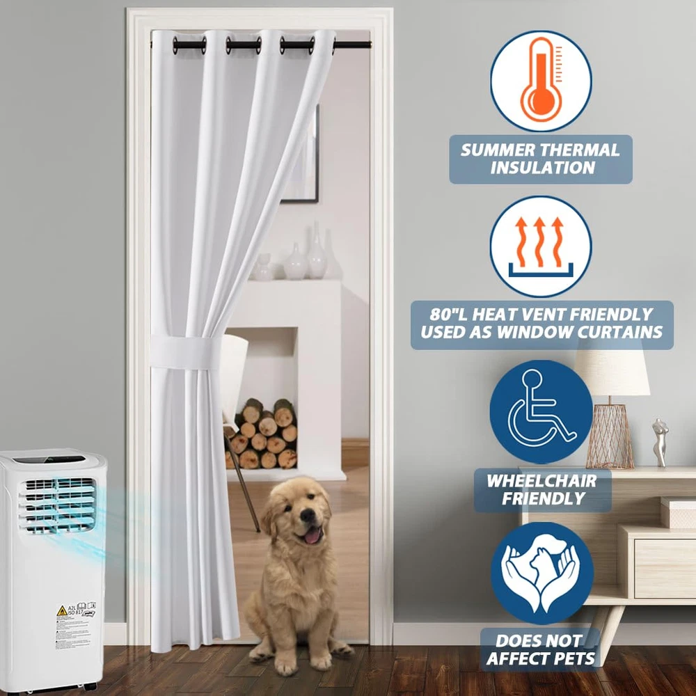 Alternative Door Ideas:Tired of not economical wood/vinyl doors?Broken tracks?Small areas not enough room such as RV?Need more conveniently pass through?This easy install soft fabric drapery is perfect for you instead of doors now. Performance:Keep full privacy against the other side.90-100% blackout. Pls understand dark colors work better.Thermal insulated like a thin blanket to keep warm in winter and block cold to save energy and ac budget.Also help on sound proof and noise cancelling. Unique Size:Custom made at 52 inch wide by 80 in drop covering basic door openings at 24x80,28x80,30x80,32x80,36x80.Pls note as the vintage antique bronze grommets sliding takes some width,you should choose a door curtain wider than the opening.If you also like accordion door and keeping the elegant ruffle effect when folded,wider size is also smart choice. Multi Functions:Simple but versatile at closet door,bathroom door,kitchen door,bedroom door,front door,sliding glass door and any openings. Product Info:Beautiful rings at top for silky sliding and folding.cloth TIEBACK included for temporary open needs.NO CURTAIN ROD INCLUDED.NO BEADS.