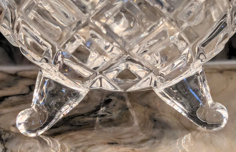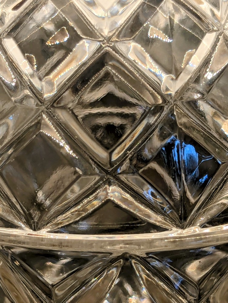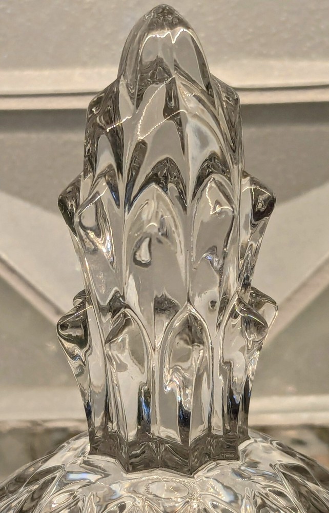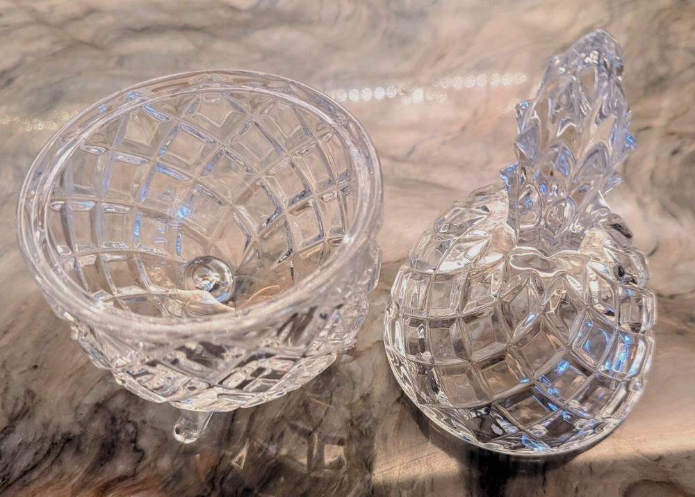 This Pineapple Brilliant Clear Cut Glass Candy or trinket Dish with Lid is from Slovakia. The intricate cut glass design features a pineapple motif, making it a stylish and functional piece for serving candies or trinkets. Made from high-quality clear glass, this dish adds a touch of elegance to any tabletop setting. The reflective glass is absolutely stunning and the footed bottom adds to the elegance of this brilliant cut artistic dish.