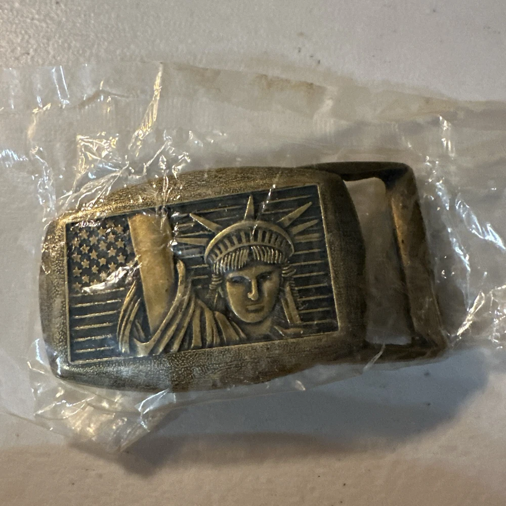 Show off your patriotic spirit with this vintage belt buckle featuring the iconic Statue of Liberty from New York City. Made from brass-plated metal, this true vintage piece is a must-have for any collector or fashion enthusiast. Measuring 2.95" (W) x 1.59" (H) and with a maximum belt width of 1.27", this buckle is perfect for both men and women. The intricate design and attention to detail make this buckle a true statement piece. It's a great addition to any vintage accessories collection and is sure to turn heads. Made in the United States in the 1980s, this buckle weighs 48G and is a true piece of history.