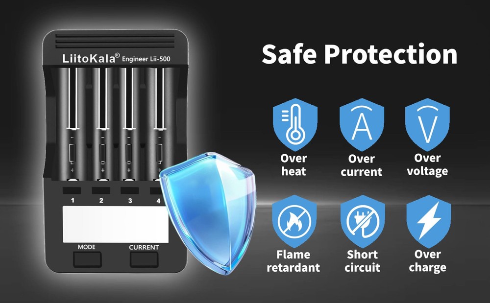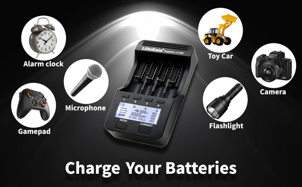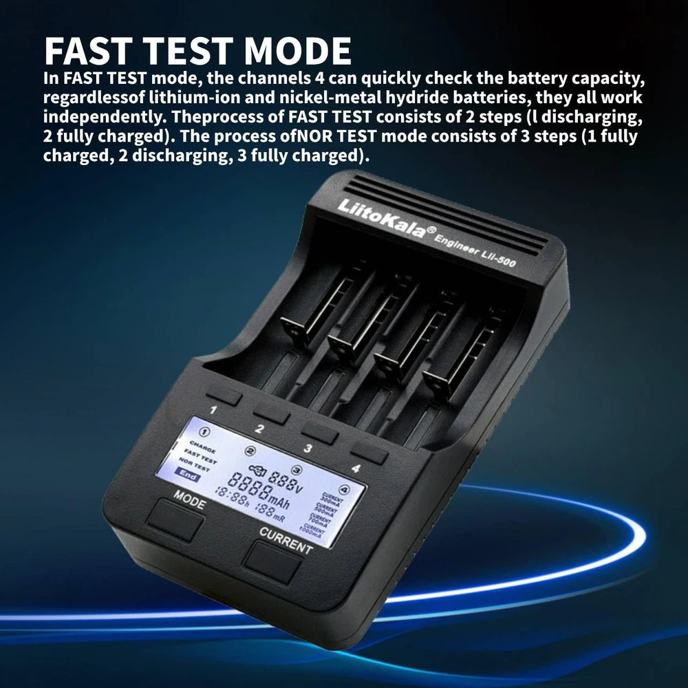 Battery Types and Sizes:Four charging current regulator(300mA/500mA/700mA/1000mA),Batteries of different specifications can be charged simultaneously our good ( Li-ion IMR INR ICR 25500 22650 18650 18490 18500 18350 16340 RCR123A 14500 10440 Batteries, Ni-MH Ni-Cd AA AAA ). Indegenhhat LED Screen:the volt, current, time, capacity and Internal rebakooe apparently, the Clisas arh, sak tesnel works independently.Can choose different current and baltery is charge, such as Lithium-ion and NI-MH battery.It is very easy to use. Test The Battery Capacity:In the FAST TEST mode, four channels can quickly detect the battery capacity.Lithium-ion battery and NI-MH battery can work independently. There are two processes for the rapid detection of battery capacity, one is discharging, another is full capacity.In the NOR TEST mode, there are three steps in the process of detecting the battery capacity(charging fully, discharging and then charging fully) CHARGE mode, FAST TEST mode and NOR TEST mode can work iron simultaneously(set charging dependently/quickly detecting the battery capacity/Normally detecting capacity) Fast And Efficient Charger: The charger has 300mA/500mA/700mA and 1000mA charge current. 1500mA battery, using 1A charging current, about 1.5 hours full. Other battery charging times are calculated like this. Series of protection functions: over-charging and over-discharging/short ,circuit/activation without any volt/charging between 1.65V-2.2V/Intelligently recognize.