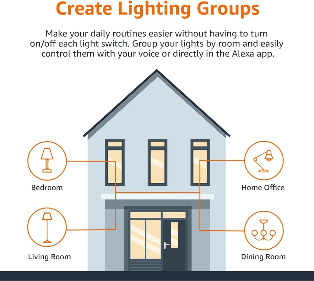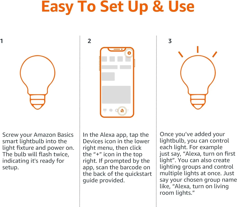 SMART UPGRADE FOR CONVENIENCE AND ENERGY EFFICIENCY : Control your Amazon Basics smart light bulbs using your voice or via the Alexa app, no more turning on/off each individual light switch. Create custom routines to schedule your lights automatically at sunset and sunrise and save energy. You can change colors of your lights for a movie night with family or friends. Works Exclusively with Alexa. Not compatible with Google Assistant, Apple HomeKit, Smart Things. SIMPLE TO SET UP WITH ALEXA: Screw in the light bulb, open the Alexa app, and get started in minutes as you get notified “ First light bulb found”. Otherwise, you can add the smart bulb directly from Alexa app. No hubs or 3rd party apps or skills required. For zero touch set up experience, check “Link device to your Amazon account to simplify setup” during checkout and get started with your smart bulb in no time. Note: Amazon Basics smart light bulbs work exclusively with Alexa to be set up with 2.4GHz Wi-Fi only. TRANSFORM YOUR SPACE WITH BRILLIANT COLORS: Create your perfect mood by choosing from 16 preset color selections and brightness levels from 5% to 100%. Have best moments during holiday festivities or gaming with friends or movie nights with family with different colors. Just say “Alexa, set the hall lights to purple”. Note: bulbs are dimmable via Alexa app or voice control only (not compatible with a physical dimmer.) CONTROL FROM ANYWHERE: Control your smart lights with Alexa app even when you are not at home e.g. from your car, office, gym. Feel secure by making your house look occupied even when you are away by creating an Alexa routine to schedule lights to turn on and off automatically. GROUP CONTROL: Create groups in the Alexa app to combine lights together, allowing you to control lights by each room, or all of your home lights with a single voice command or via app. When it's time to sleep, just say “Alexa, turn off the bedroom” OR use the Alexa app to turn off the bedroom lights at once. SUITABLE FOR EVERY ROOM: Upgrade your home by adding smart lights to every interior space, including damp locations like bathrooms. These Alexa compatible smart light bulbs offer effortless convenience, allowing you to control your lightbulbs with voice commands or the Alexa app. Enjoy the versatility of color changing light bulbs, ideal for setting the mood for movie nights or festive gatherings. With no hub required, these WIFI light bulbs connect directly to your network, making the setup process a breeze. Transform any space using the smart LED light bulbs' 16 preset colors and adjustable brightness levels from 5% to 100%. Simply say, “Alexa, set the lights to blue” for an immersive experience. Manage your smart home from anywhere with remote light bulbs controlled via the Alexa app, ensuring peace of mind by scheduling lights to turn on or off automatically when you’re away. With the ability to create groups in the app, you can control smart lights by room or manage all your Alexa bulbs simultaneously with a single command. These RGB light bulbs cater to your diverse lighting preferences, while the smart led bulb design offers energy efficiency.