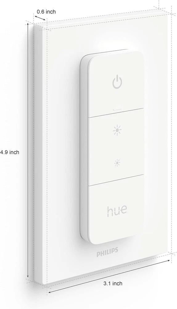 This Dimmer switch makes it easy for anyone in the home to control Hue smart lights with a touch of a button whether or not they have the Hue app or a voice device handy. The dimmer switch adds more convenient ways to control your Hue lights whether for guests, kids, or even yourself. The dimmer switch lets you turn lights on or off, dim or brighten, or toggle between four of your favorite light scenes. You can also get the best light based on the time of the day, perfect for tuning light to your circadian rhythmn. The dimmer switch is easy to set up. Add it to a Hue Bridge-controlled set-up to customize the settings in the app. Press the Hue button on the switch cycle through your favorite light scenes or get the right light based on the time of day. Three clearly marked buttons make the dimmer switch simple to use. With it's battery-powered design and the included adhesive, the dimmer switch can be placed anywhere. The long-lasting battery has a minimum lifetime of 3 years. It's magnetic backing even lets you attach it to the refrigerator or other metal surfaces. A Hue Bridge is required to connect the dimmer switch to your Hue set-up. The Bridge unlocks the full power of Hue smart home lighting by unlocking features like multiple room control, out-of-home control, automations and more. Enjoy reliable and secure connectivity when you add a Bridge, all without putting a strain on your Wi-Fi. WHAT’S IN THE BOX - Includes one latest model (V2) battery-powered dimmer switch; add more ways to control your Hue lights for everyone in your home, including kids and guests REQUIRES A HUE BRIDGE - Unlock the power of Hue and enjoy automations, control from anywhere in the world, and a secure, stable connection that won’t drain your Wi-Fi. Use Matter to connect your smart home devices to your Hue smart lighting system. ENJOY PRESET SCENES - Dims and brightens, turns lights on and off, cycles between four of your favorite scenes or provides the right light based on time of day SET UP - Mount to the wall with included adhesive, mount to a metal surface with the magnetic backing, or remove the switch from the plate to use as a remote. Open the Hue app and follow the prompts to connect the dimmer switch to your Bridge PERSONALIZE YOUR LIGHT - Customize settings in the Hue app; select the lights you want to control with the dimmer switch and personalize the settings