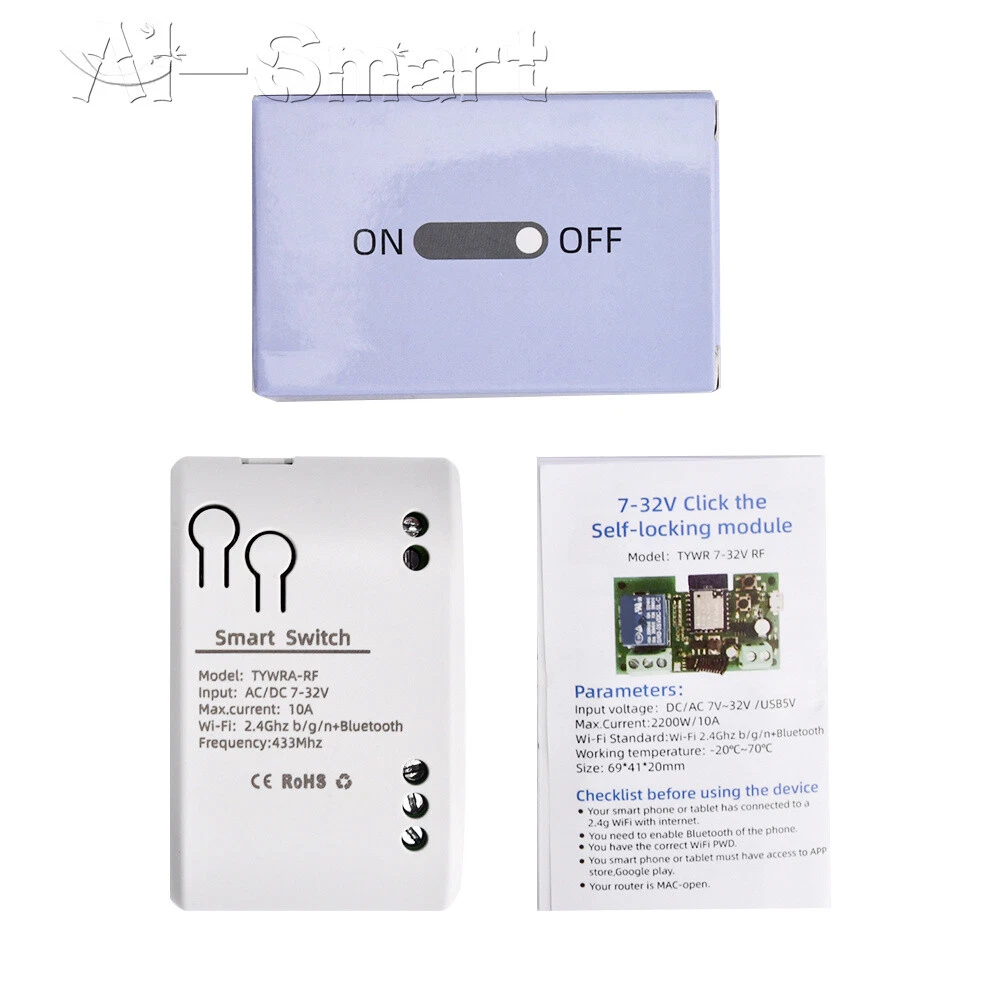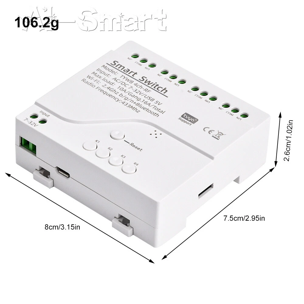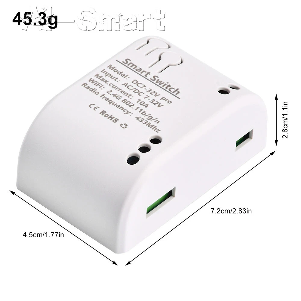 Smart Remote Control Wireless WiFi Switch Relay Module 1/2/4CH DC7-32V/AC85-250V Features: App support: Free iOS and Android mobile app Smart Life / Tuya Smart. Synchronised status: Real-time device status provided to the app. Remote on/off: remote on/off of 4 electronic devices from anywhere. RF remote control: Indoor 433MHz RF remote control on/off, only 433MHz learning code is supported Some 433 remotes may not be supported. Independent control: control each gang individually in the APP Doodle. Supports remote turn on or off of connected appliances such as lights, kettles, rice cookers, electric curtains etc. DIN rail mounting: ideal for industrial control. Voice control: perfect compatibility with Google Nest, IFTTT... Shared control: control your smart home with your family. Product parameters: Input voltage: DC 7V~32V/AC85-250V (optional) Micro USB: 5V Maximum current: 2000W /10A Wireless Standard:Wi-Fi 2.4GHz b/g/n RF: 433MHz Operating temperature: -20°C~70°C Please check the following before using the device: Your smartphone or tablet is connected to a 2.4G WIFI with internet access (5G WIFI is not supported at this time) The phone is Bluetooth enabled Your Android phone or tablet must be version 4.0 or above With an Apple phone or IPad you must be able to access the APP shop and download the APP If your wireless router is set up with MAC address filtering, please enter the background of the router to turn off the MAC over speed function first Packing list: 1*Wifi Remote Control Module Shipping Payment Return Policy Feedback Shipping 1,We will arrange shipping for you within 24 Hours after payment cleared except the holidays. 2,We only ship to the confirmed address provided by PayPal. Before you pay, please make sure your address in PayPal matches the address you would like us to ship to. If not, please let us know before we sent you the package, or we will not be responsible for any loss. hope you could understand. 3,we will ship out the order in 1-2 business days after payment cleared .Since it is international shipping ,delivery time is about 15--28 business days to arrive to most countries. 4,We ship items to Worldwide. Thank you! Payment We accept PayPal payment ONLY. If you do not have Paypal account, please registered with (http://www.paypal.com) Payment must be received within 5 days after auctions ended. Please do not bid if you are not intending to buy. Unpaid dispute will be filed to ebay for the non payable bidders. Return Policy We are not responsible for custom duty or import tax. We will leave POSITIVE FEEDBACK after receiving the payment. Please contact us if your are not satisfied with the item after receive it. We could offer refund, and refund request is available only requests within a week after parcel received & returning the item as the same condition as received. We offer 100% refund if the item is broken before arrival , all you need to do is sending us the clear pictures to show it is broken. Defective situation must be noticed within 7 days after delivery. All emails will be answered within 1 business day. If you do not receive our reply, please kindly re-sent your email,and we will reply to you as soon as possible. All items sold by us are being described to the best of our abilities, as accurate as possible, and with utmost conscientiousness on our part.However, to avoid any potential oversights, I respectfully request your assistance in helping us to make this a mutually satisfactory transaction by Thoroughly reviewing item description and photos, and asking all questions Prior To Bidding. Please Note that size and color representation are subject to manufacturing variance and may not be exact. Also note that monitor settings may vary from computer to computer and may distort actual colors. Please read these terms thoroughly before placing your bid. Feedback We will automatically leave a positive feedback to everyone who has complete the transaction and leave us positive feedback. Please do not forget to give us Five Stars on all of the Detailed Seller Ratings. Thanks! In the unlikely event you are not satisfied with the transaction, please contact us before you sumbit your evaluation. We believe that everything could be solved by communication. 1.in order to provide you the best service*****,please treat the transaction fairly.*feedback is simply what we pursue. 2.Please Do contact us first to get a better solution before you would leave a *neutral or *negative feedback 3.We strive for 5-star service by stating upfront our policies, our shipping rate& our shipping frequency. if you were pleased with this transaction, please respond with all 5 stars! if you are not pleased, simply let me know via e-mial rather than leave low score, and I'll work to make it that way 4.Please email me through 'MY MESSAGES' or "Ask Seller Questions" if you have any question about our listing or your purchase