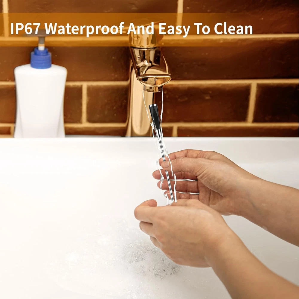 Smart Wireless Meat Thermometer 3.9mm Ultra-Thin 777FT Range Small, Black Product Details Brand: BtcLink Special Feature: Alarm Color: Black Age Range (Description): Adult Included Components: 1*probe 1* booster Outer Material: Stainless Steel Display Type: Digital Connectivity Technology: Bluetooth Unit Count: 1.0 Count Power Source: Battery Powered Smart Cooking Tool: Built-in sensor can track the real-time temperature of your meat and send an alert to the app, allowing you to cook with complete flexibility, and just relax on your sofa without worrying about overcooking and undercooking with our smart meat thermometer digital with app. Uncanny Accuracy and instant read : Wireless meat thermometer with advanced temperature sensor provides instant readings within 2 seconds. Probe temperature range -4°F to 932°F (internal temperature up to 212°F/100°C & handle withstand temperature up to 932°F/500°C), accuracy ±1.8°F/1°C. Whether you're bbq, smoker, rotisserie and sous vide.You'll get the information you need to fast and accurately. Say good bye to vercooked or undercooked food. 777FT long distance connection: BtcLink 5.4 Bluetooth technology enables a stable connection range of up to 777ft (without any obstacles) or 500ft (materials such as solid substances,glass, wood, metal, and concrete) for the wireless meat thermometer. You no longer have to worry about application disconnections, ensuring a reliable connection. 100% no wire: Smart wireless meat thermometer eliminates all tangled wires, making it a versatile tool for rotisserie, smoker, oven, grilling, etc. You will no longer be tied to the kitchen, constantly checking your food temperature, and easily achieve a master chef level of cooking. The probe sensor responds in 2 seconds, ensuring temperature accuracy within ±1.8°F, helping to avoid overcooking or undercooking of the food Easy to Use & Clean: Smart digital thermometer has a pre-programmed function for different types of meat, so you only need to select the type of meat and the optimal temperature (steak, turkey, fish,chicken). It notifies you when the food has reached the desired temperature.making it a great gift for cooking enthusiasts and beginners.