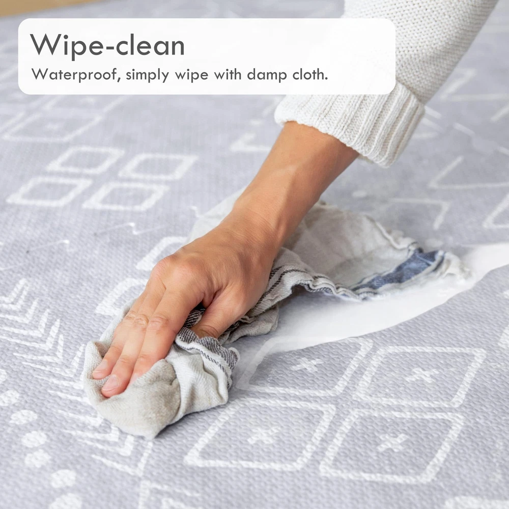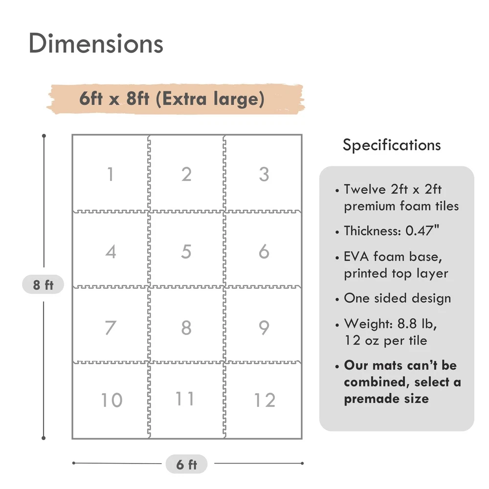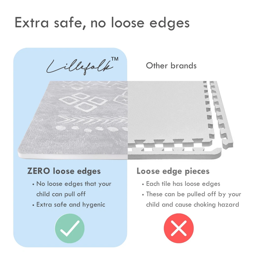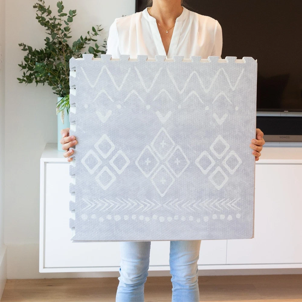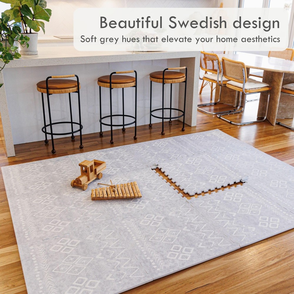 designs with you in mind - Where Safety meets Sophistication. Your playmat doesn't have to make your home look like a preschool. So many tummy time mats, baby gym cushions, and children's rugs have bright primary colours and don't match your home. Our floor cushion has a 'Scandi-tribal’ design to complement the modern home even the most sophisticated elegance. Timeless inspiration from minimalist Swedish design and ancient tribal patterns. The neutral grey and white colors are selected to blend perfectly with your unique home décor. We do our research! The biggest complaint parents have with foam play mats and nursery rugs is that they can be pulled apart into small pieces, especially the edges, creating a choking hazard. quickly break down, which creates little pieces for little mouths. Our mat is made of premium quality, non-toxic, EVA foam that exceeds US Toy Safety standards. Easily wiped clean with a damp cloth. Made with ZERO small edge pieces to prevent choking hazards. Each tile measures 2 ft x 2 ft and 0.47 inches thick, making it comfortable on infant’s knees. The tiles interlock to connect into a 6 ft x 4 ft area playmat for easy assembly and safe baby playtime. SCANDINAVIAN DESIGN: Inspired by Swedish minimalism and a neutral palette, the playmat blends with your home and playroom décor and provides a safe and calming play area for your baby or toddler. PVC, BPA FREE: Made with certified premium quality EVA foam, our playmats are rigorously tested to exceed US Safety standards. Free from phthalates, heavy metals, PVC and lead, as well as hypo-allergenic, odour free and safe to use as nursery flooring for newborn infants and babies. SOFT AND EASY TO CLEAN: Measuring ½ inch thick, our soft and cozy playmats are perfect for tummy time exercise and learning to sit or crawl. They double as soft padding for mom and dad’s knees, are 100% waterproof and can be wiped clean with a damp cloth. PREMIUM SAFETY: Comes with large two x two ft interlocking floor tiles. We are the ONLY foam puzzle brand that does not have any loose edges that can be peeled off. This means increased safety for your little one and quicker assembly. PARENT to PARENT PROMISE: From one parent to another, values each customer and strives to ensure happiness with every product; our commitment is to producing the highest-quality playmats for your little ones.