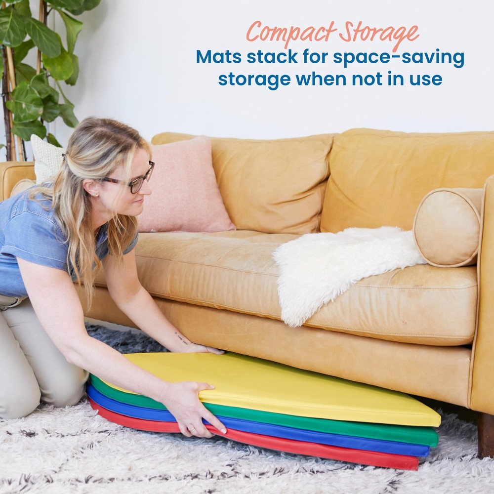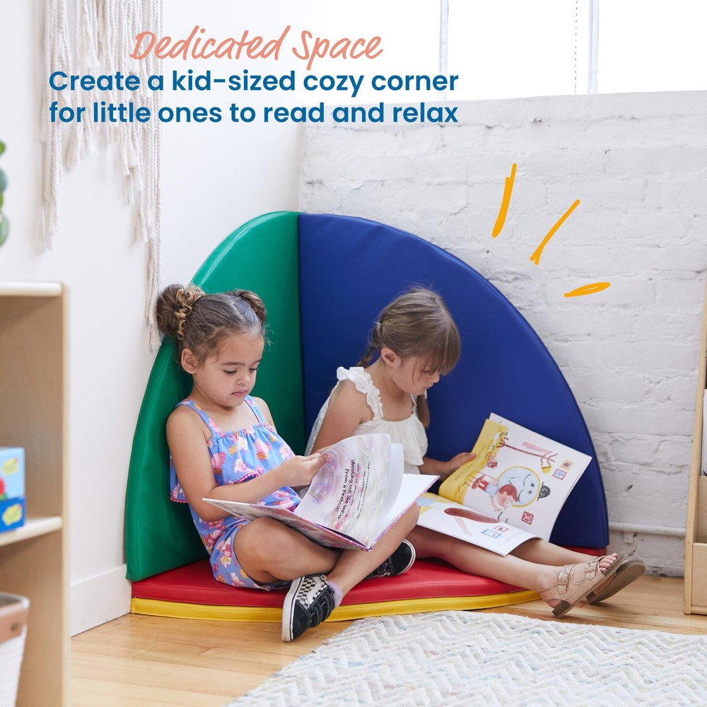 Toddler Reading Corner: Circular floor mats can be assembled as a kids' cozy corner providing a safe place for little ones to read a book, relax, and enjoy quiet time activities in a home or school Multipurpose: Pieces can be used to teach color recognition, as floor cushions to create a designated seating area, or against a wall with a floor mirror for sensory exploration and tummy time Durable Materials: Dense foam core is covered in soft vegan leather and features a non-slip base for added stability when in use; easily assemble pie-shaped pieces with included stay-put fasteners Certified Safe: The latex-free foam play pad is GREENGUARD [GOLD] Certified for low VOCs, CPSIA compliant, and adheres to CAL TB 117 requirements Product Dimensions: The kids' cushions for the playroom measure 58" D x 1" H when assembled as a circle mat; Adult Active Engaged & Direct Supervision Required