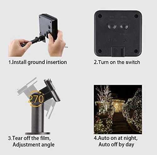 " Light up your House & Garden with the string light Stand out with your unique decoration to be the most eye-catching site! Powered by solar energy during daytime, this eco-friendly string light can brighten and twinkle like stars at night. Use under different weather The led string lights can illuminate for around 18 hours if the solar panel is charged in sunny day for more than 6 hours.No worry to use them under bad weather such as cloudy, rainy or snowy days. CONVENIENT AND ENERGY EFFICIENT 2 Switch Buttons - POWER ON/OFF. Please remove the surface protection film and turn on the switch for solar charging. Photosensitive system, please keep the switch open, Auto lights up at night and auto turns off during the day. MODE (8 flashing modes). PERFECT FESTIVAL DECORATION IDEA LED string lights, warm-white glow lends a cozy and festive touch to varied areas such as garden, patio, bedroom, living room, deck, pool, yard, pathway, etc.; superb as a decorative accessory during weddings, holiday parties, festival occasions; also usable at retail and business locations. NOTE: Please ensure that the solar panel is pointed toward the sunlight. the best angle between solar panel and sunlight is 90 degrees. 2 Buttons & 8 Modes 2 Buttons : ON/OFF Button and MODE Button 8 Modes: Different flashing light & Continuous light. (Press "MODE" button to change the Mode) Technical Specifications Light Color: Warm White Overall Length: 22m/72ft(2 pack) LEDs Spacing: 0.32ft LEDs: 100 pcs/1 pack Power Support: Solar powered Waterproof: IP 65 Illuminate Period: at least 100,000 hours Package List 2 x Solar Powered String Lights 1 x Solar Panel with Install Fittings 1 x User Manual Have a blissful and star-flash Night! Click Add to Cart to claim your magical String Light from ! Solar Powered Fairy String Lights:Get 2 in 1 package! 2 Pack 100 Led Solar fairy string lights, 100 Super Bright LED bulbs on 33ft high quality copper wire, with steady 360 degree viewing angle they illuminate in every direction. 100 LED twinkle lights glow a cool white lights , which are so bright and adding some romantic ambiance. Ideal for decorating your gardens, patio, gate, yard, wedding, party etc. 8 Modes for you to choose: Auto on at dusk, auto off by day. 8 MODES for you to choose:combination, in wave, sequential, slo glo, chasing/flash, slow fade, twinkle/flash, and steady on. with Safety, Water Resistant: No heat, no radiation, low consumption, high safety. Both the string lights and the solar panel are IP65 Waterproof. No worry to use them in the rain, perfect as DIY decoration for party Christmas garden patio home in any shape and any places, excellent choice as wedding festival holiday decoration. Easy to Shape ,Perfect for DIY: High flexible copper wire could be molded into any shape. Great decoration for indoor& outdoor. Perfect as DIY decoration for party, Christmas, garden, patio, home in any shape and any places, excellent choice as wedding festival holiday decoration. Steps for Usage: Step 1 - completely covering the solar panels. Step 2 - Turn on the switch. Step 3 - the light up. If the light is not lit, or the light is dark, or the lighting time is short, you need to charge it in the sun for day. NOTE: Charging environment, direct sunlight, charge 1-2 hours - light up 2-4 hours, charge 4-8 hours - light up 6-12 hours. If there is no sunlight on a cloudy day, it will light up 1-2 hours or dim.