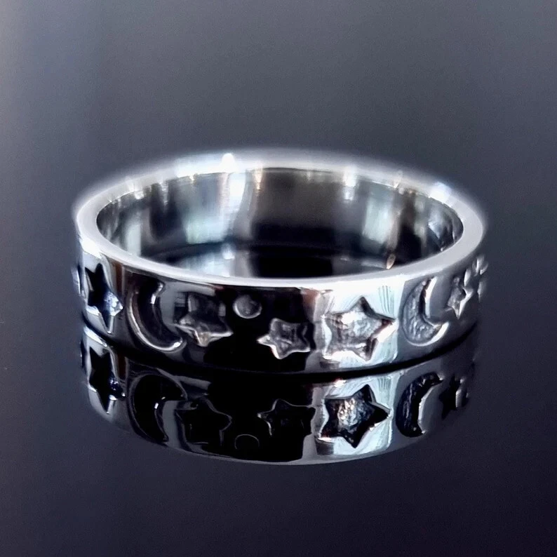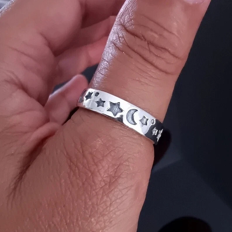 Solid 925 Sterling Silver Star & Moon Unisex Thin Celestial Band Ring Gift For Elevate your style with this stunning Star and Moon Sterling Silver Ring. Perfectly crafted from high-quality 925 sterling silver , this celestial-themed ring is an elegant addition to any jewelry collection. Featuring intricate star and moon designs, it’s ideal for those who adore astrology, celestial motifs, or simply enjoy unique, standout pieces. Key Features: Material : High-quality 925 sterling silver , known for its durability and lasting shine. Design : Elegant star and moon motifs, symbolizing the celestial wonders of the night sky. Style : A thin, yet wide band , offering a comfortable fit and bold look. It can be worn as a thumb ring or on any other finger for a versatile style. Unisex : Designed to fit both men and women, making it a perfect gift for anyone who loves celestial-themed jewelry. Size : Available in R18 . (Custom sizing may be available; check with the seller for details.) Versatile : Ideal for everyday wear, this ring is lightweight and durable, suitable for casual or formal outfits. Perfect Gift : A thoughtful and unique gift for birthdays, holidays, or any occasion for lovers of astrology, the moon, stars, or celestial-inspired jewelry. Why Choose This Ring? Timeless Design : The beautiful star and moon design gives a sense of wonder and magic, making it a perfect accessory to express your love for the cosmos. Quality Craftsmanship : Made with 925 sterling silver , a high-quality metal that resists tarnishing and maintains its shine. Comfortable Fit : The thin band ensures a lightweight, comfortable feel, while the wide design adds a bold statement. Ideal for Daily Wear : Whether you're dressing up or down, this celestial ring is perfect for any occasion.
