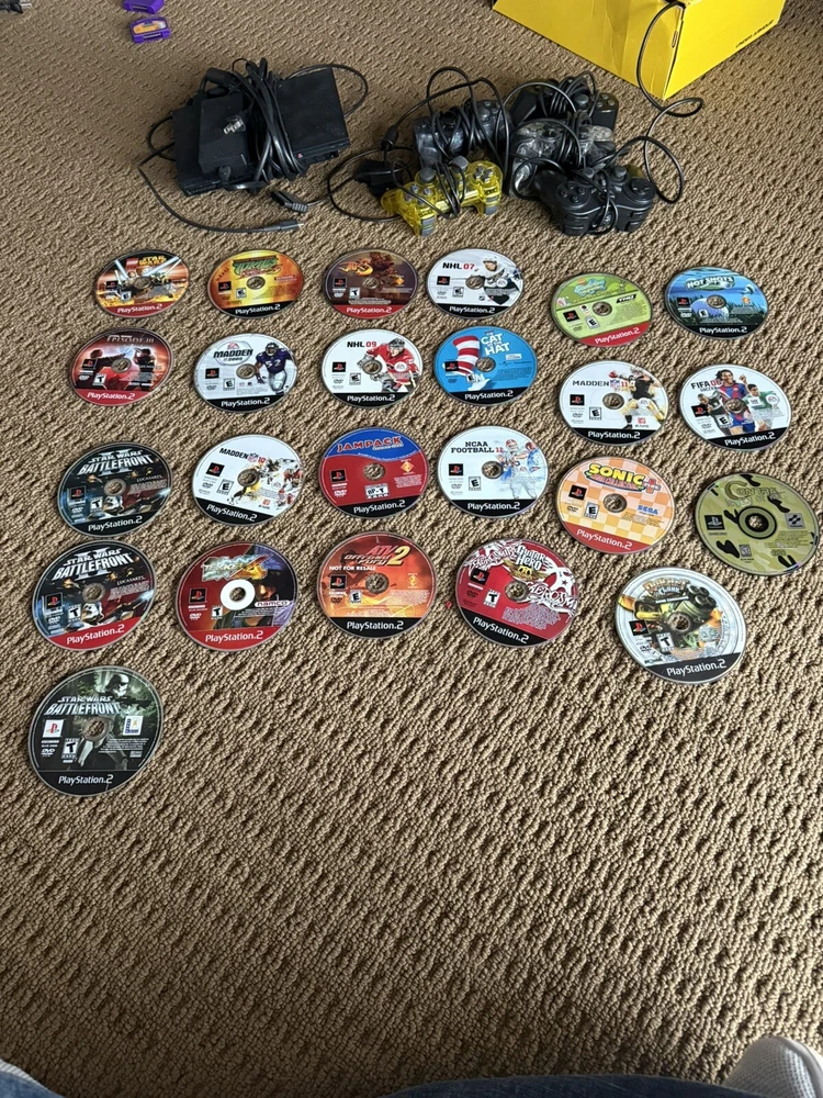 Works good , 5 controllers and games : Lego Star Wars , tmnt mutant nightmare 3 , jak 3 , nhl 07, SpongeBob squares pants , hot shots golf, cat in the hat, jampack tekken4 , sonic mega collection, contra legacy of war , ratchet and clank going commando, Star Wars battlefront 1 and 2 copies of battlefront 2