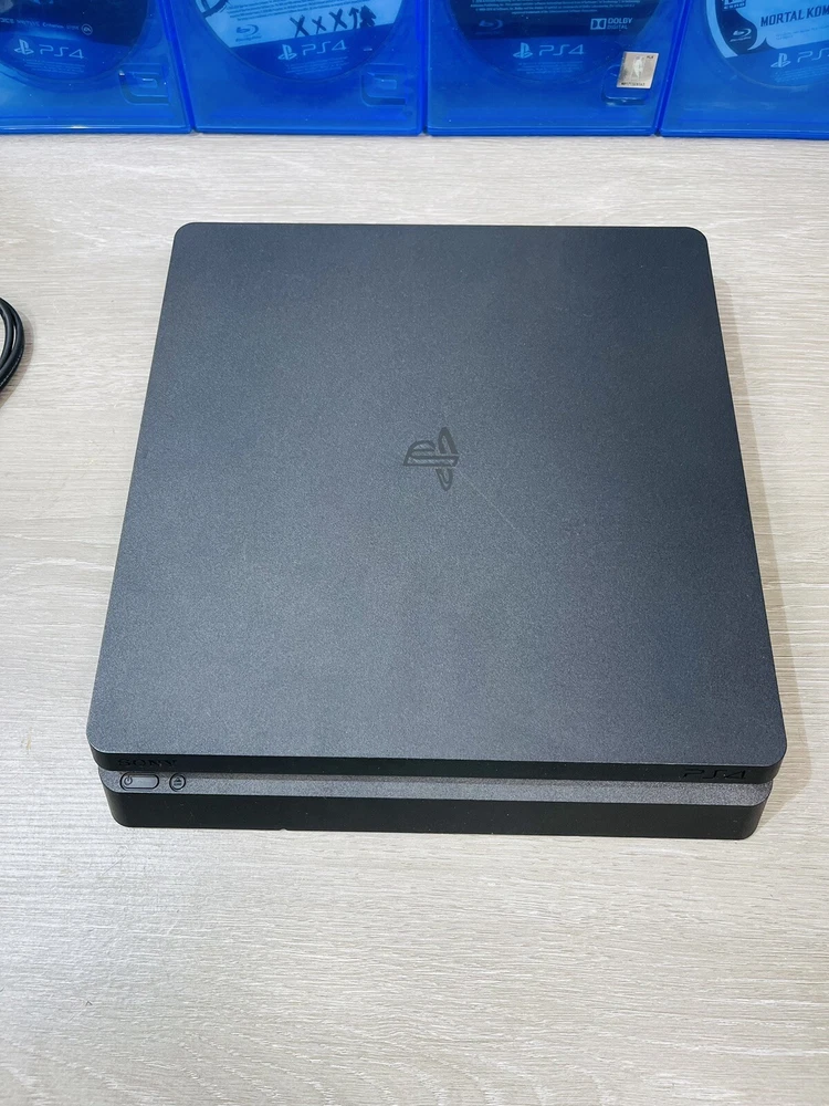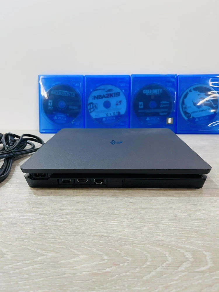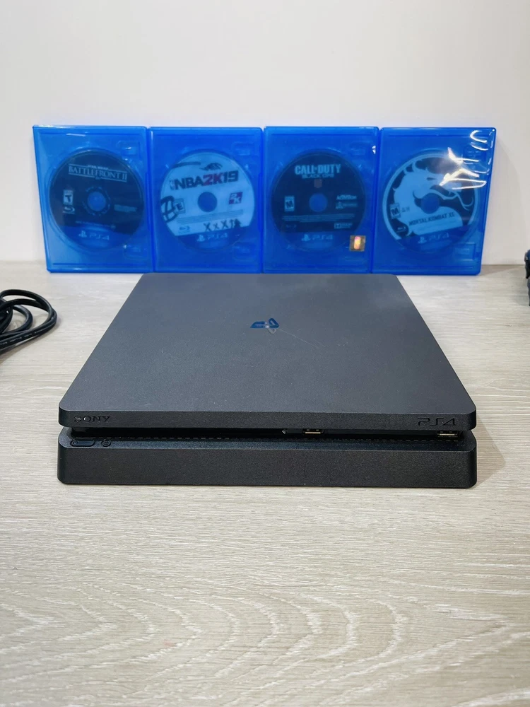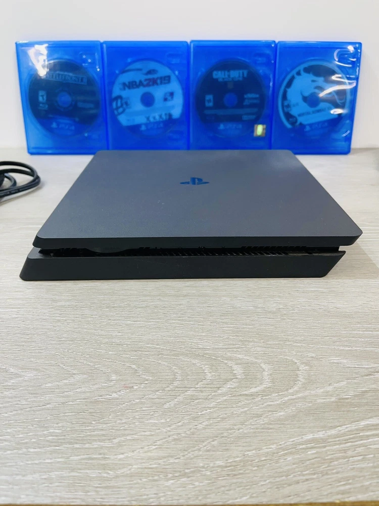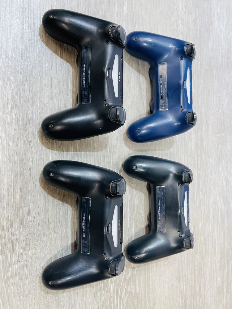 In good working condition, the PS4 slim has been upgraded to one terabyte , All four controllers hold a charge and work , One does have a lifted cover . There is minor wear present to the system and controllers .