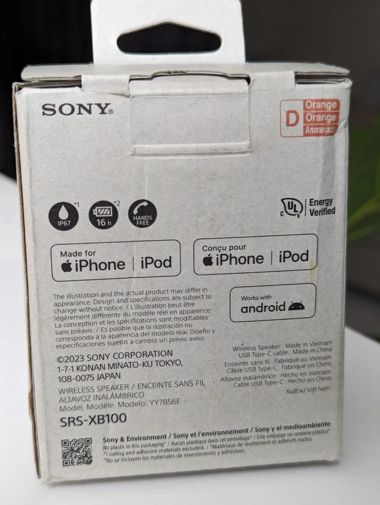 Sony XB100 Compact Bluetooth Wireless Speaker | Orange New Condition - Open Box Include the Speaker, USB Cable and Original Box Enjoy powerful, clear sound, with a deep bass Sound Diffusion Processor expands sound far and wide Waterproof and dustproof (IP67 rated) Up to 16 hours of battery life with indicator Compact portable design with versatile strap included Compatible with a second speaker for stereo sound Connect and stream music easily with Bluetooth Crystal-clear hands-free calling Microphone w/ echo cancelling technology USB Type-C port Free Shipping