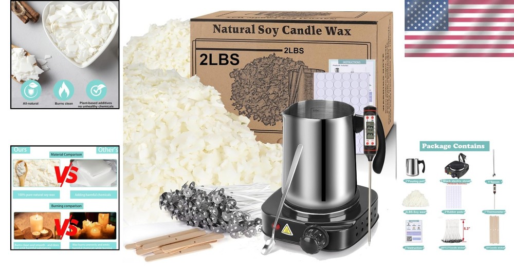 Soy Wax Candle Making Kit Supplies With Melter Natural Candle Wax DIY ‹ › ‹ › ‹ › ‹ › ‹ › ‹ › ‹ › ‹ › ‹ › ‹ › Soy Wax Candle Making Kit Supplies Craft Beautiful Candles with Pure Elegance Transform your living space and embrace your creativity with our 100% Natural Soy Wax Candle Making Kit. Designed for both enthusiasts and beginners, this kit embodies the perfect blend of quality materials and user-friendly instructions. Features: 100% Natural Soy Wax: Enjoy a clean and smooth burn without the unhealthy chemicals found in paraffin wax. Our sustainable, plant-based materials ensure that your candles not only look beautiful but are also good for the environment. Super Easy to Make: Our detailed step-by-step guide allows you and your family to create stunning candles with ease, making it a delightful bonding experience. Microwavable Candle Wax: Melt with perfection in the microwave without the mess, making it a hassle-free crafting adventure. Excellent Scent Throw: Create enchanting scented candles with a beautifully diffused fragrance. Remember to pour essential oils between 125-140°F for optimal results! Complete Candle Making Kit: Includes 2 lbs of soy wax flakes, 100 candle wicks, 120 wick stickers, stainless steel pouring pot, thermometer, and more, providing you with all the tools you need to get started. Safe & Reliable Equipment: Our electric stove comes with temperature control, overheat protection design, and efficient bottom heat dissipation for safety and reliability. Perfect for Gifting & Creating Memorable Moments This kit makes a thoughtful gift for friends and loved ones; create heartfelt memories as you craft together. Dive into the enjoyable journey of candle-making and bring warmth and fragrance into your home. Quality You Can Trust We put love and care into every detail of our kit, ensuring each item is neatly packed and quality checked before shipping. If you encounter any issues, our customer service team is here to support you within 24 hours. Indulge in the art of candle making and embrace creativity with our Soy Wax Candle Making Kit—experience the joy today! Shipping Free & Fast Shipping - We offer free shipping to most of the USA with a normal delivery time of 3-7 days. However, due to the current situation, additional delivery time (up to 3 weeks) may be required for some items. Alternative Carriers - We may use alternative carriers (e.g. USPS, FedEx, UPS, etc.) to ensure your package arrives safely and on time. Due to the use of multiple carriers, we are unable to provide a tracking number automatically. Handling Time - Orders are processed and shipped within 1-2 business days of receiving cleared payment. Shipping Restrictions - Shipping to Alaska, Hawaii, Puerto Rico, Guam, and other US territories may incur shipping charges or delivery restrictions. Please contact us before ordering, or your order can be refunded/cancelled. State Restrictions - There may be restrictions based on your state of purchase. For example, certain items may not be shipped to California due to state regulations. Contact for Tracking Updates - If you require tracking updates or have any concerns about the delivery of your order, please feel free to contact us, and we will be happy to assist you. Return 30-Day Hassle-Free Returns - We want you to be completely satisfied with your purchase. If you are not, you can return the item within 30 days of receiving it for a full refund or exchange. Easy Return Process - To start a return, simply contact us and we will provide you with a prepaid return shipping label and detailed instructions. Restocking Fee - There are no restocking fees for returns. However, the buyer is responsible for return shipping costs if the return is not due to a seller's error. Refund Processing Time - Refunds will be processed within 5 business days of receiving the returned item in its condition. Payment We accept all major credit cards, PayPal, and Apple Pay for your convenience. Your payment information is secure and encrypted to ensure a safe and seamless transaction. Please complete your payment within 3 days of purchase to avoid any delays in shipping. Feedback Your feedback is extremely important to us. We strive to provide the best products and customer service possible. If you are satisfied with your purchase, please take a moment to leave us a positive review. If you have any concerns or issues with your order, please contact us before leaving negative feedback. We are committed to resolving any problems and ensuring your satisfaction. Contact Us If you have any questions or concerns, please feel free to out to our customer support team. You can contact us through the eBay messaging system. We are available Monday to Friday, 9:00 am to 5:00 pm EST, and we will do our best to respond to your inquiry within 24 hours. Buy it now and enjoy a pleasant shopping experience! Unit Quantity: 2lbs Craft Type: Candle Making Candle/Soap Base: Soy Wax Candle/Soap Type: Container Unit Type: Unit