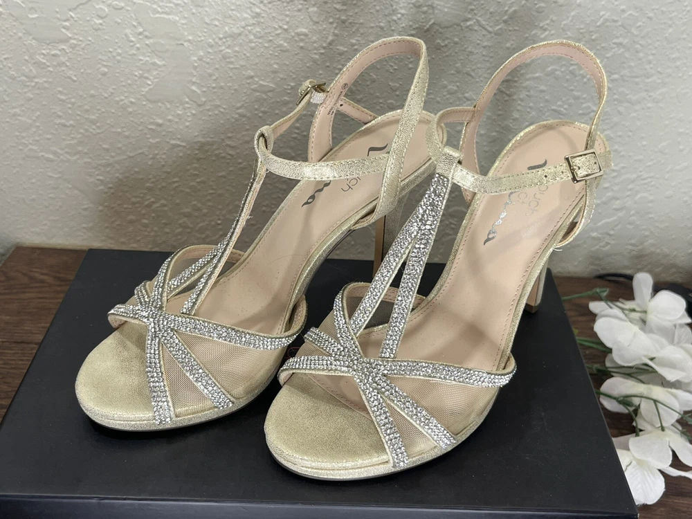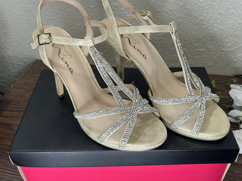 Step out in style with these Silver rhinestones on a beige base, 'Touch of Nina' Heels. The strappy sandals feature a sparkly silver rhinestone pattern with glitter and beaded accents. The open toe stiletto heels are perfect for formal occasions and add a touch of glamour to any dress. The shoes are available in women's size 7M and are suitable for various events. The synthetic upper material ensures durability, while the stiletto heel style provides a chic and elegant look. Absolutely gorgeous pair of shoes. Perfect for prom, homecoming, any formal event. These shoes are an excellent condition and barely show where if it were not for a little soil on the bottom of the SOLE. These issues come in their original box.
