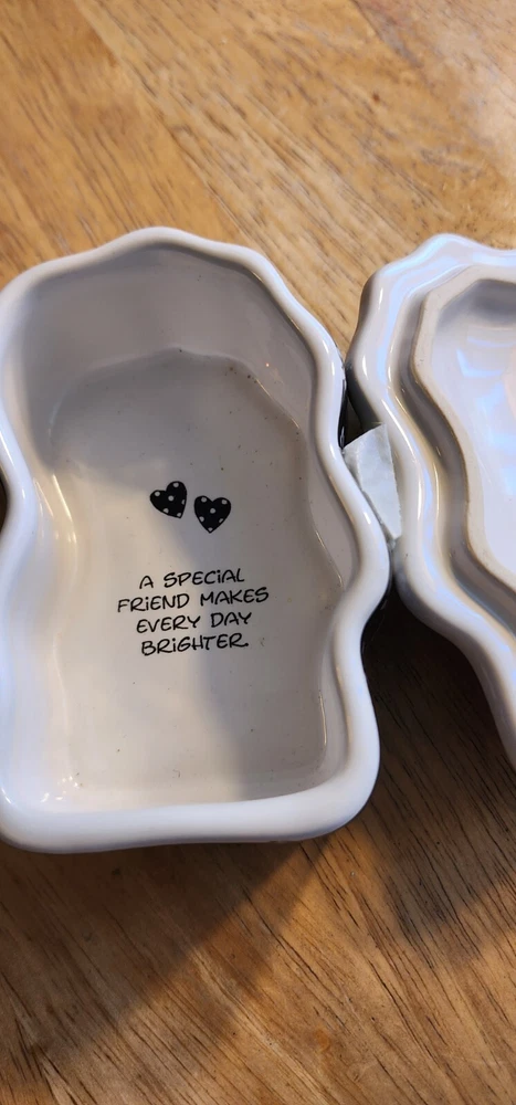 This trinket box is in great condition. There are no chips or cracks that can be seen. It is 4" long X 3" wide X 2" deep.