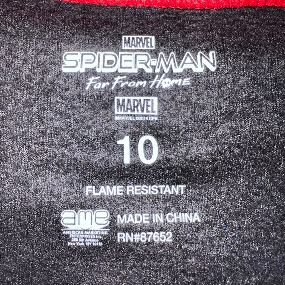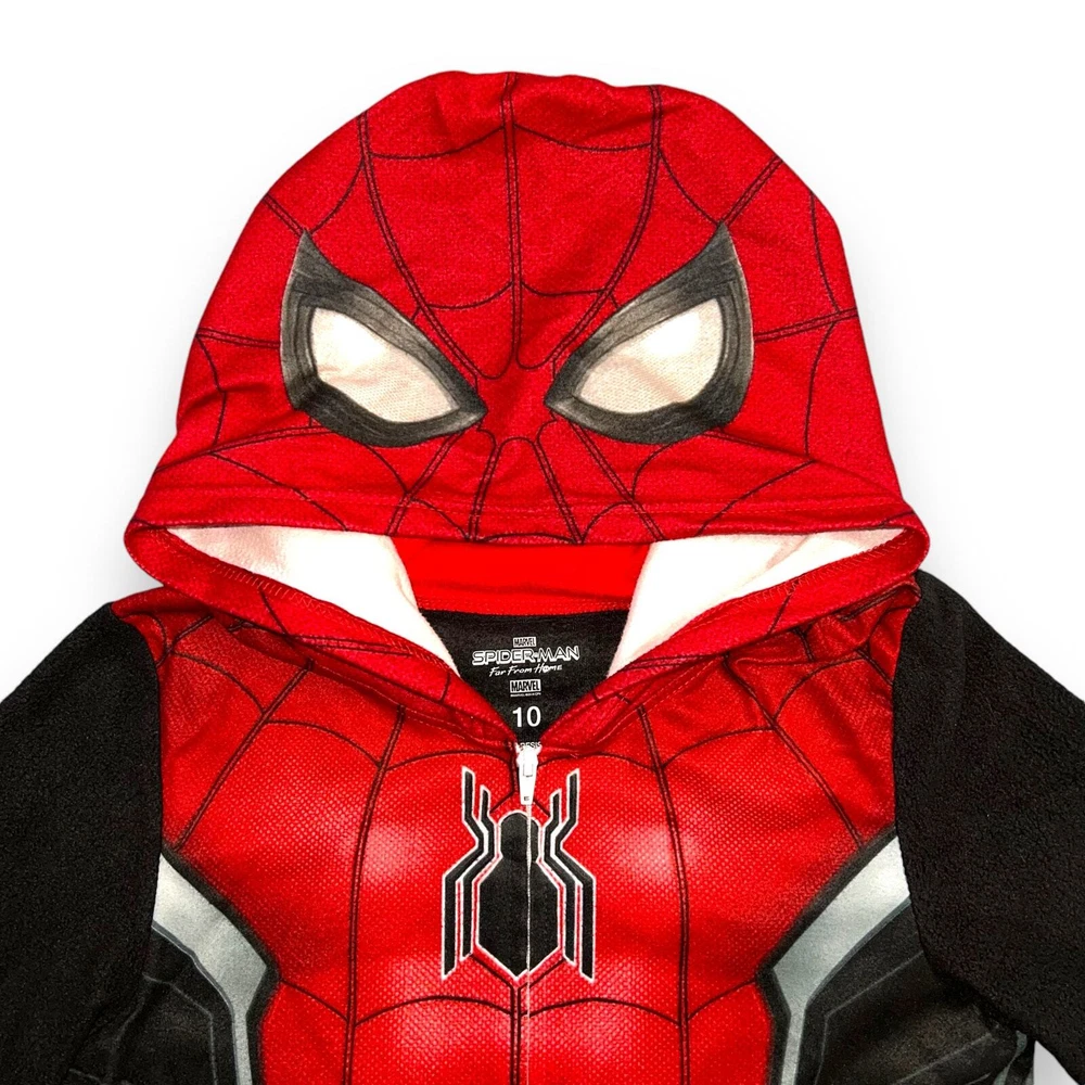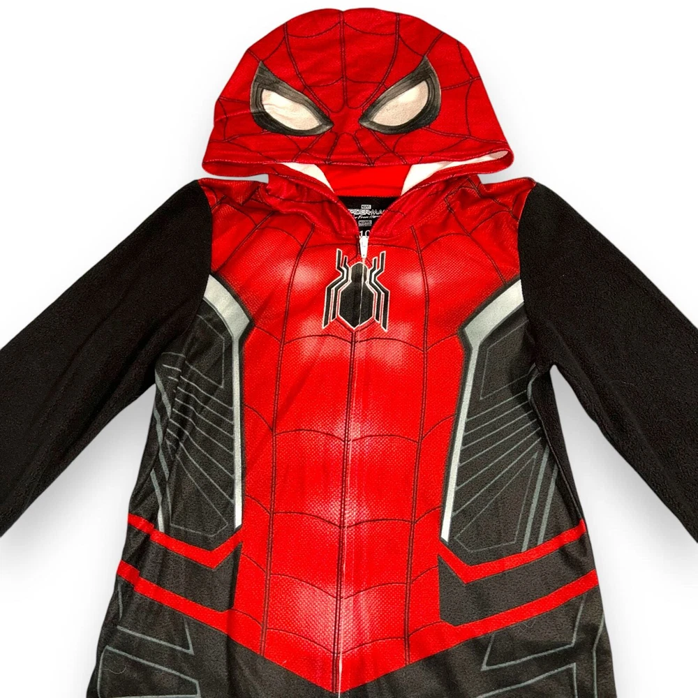 One Piece Fleece Pajama Suit Marvel Far From Home Black Red Spider-Man Condition: EUC Size: Boys 10 Description: Fleece pajamas Marvel Spider-Man Far From Home Long sleeves Hooded Zip closure Red white and black Made in China Polyester Machine washable Pajama pjs sleepwear movie comics tv cartoon super hero loungewear Halloween costume party sleepover If purchased by noon central time I try to ship same day Weight: 8oz SKU: Marvel Far From Home Fleece Pajama Suit One Piece Black Red Spider-Man