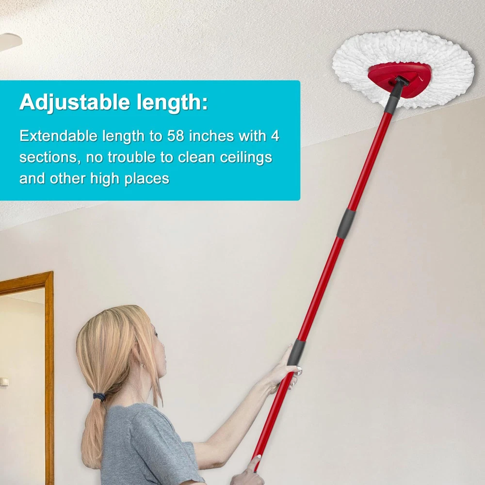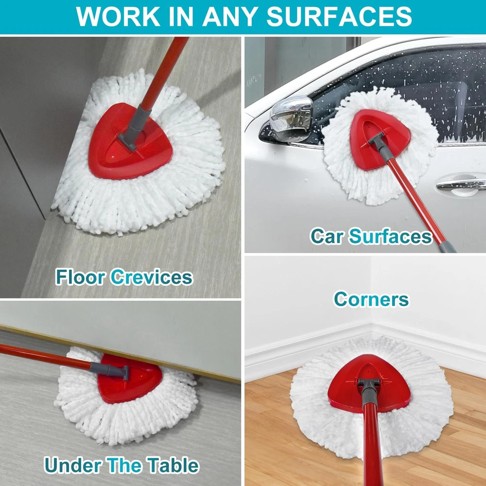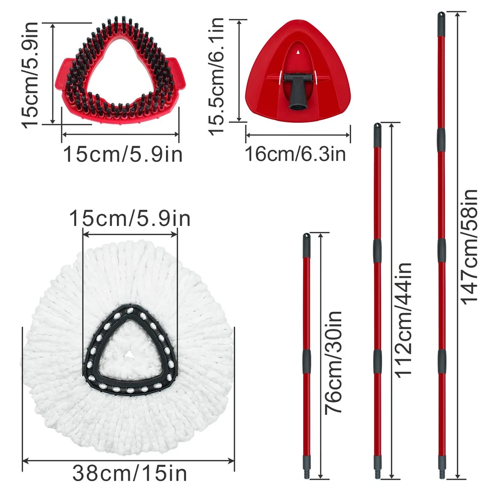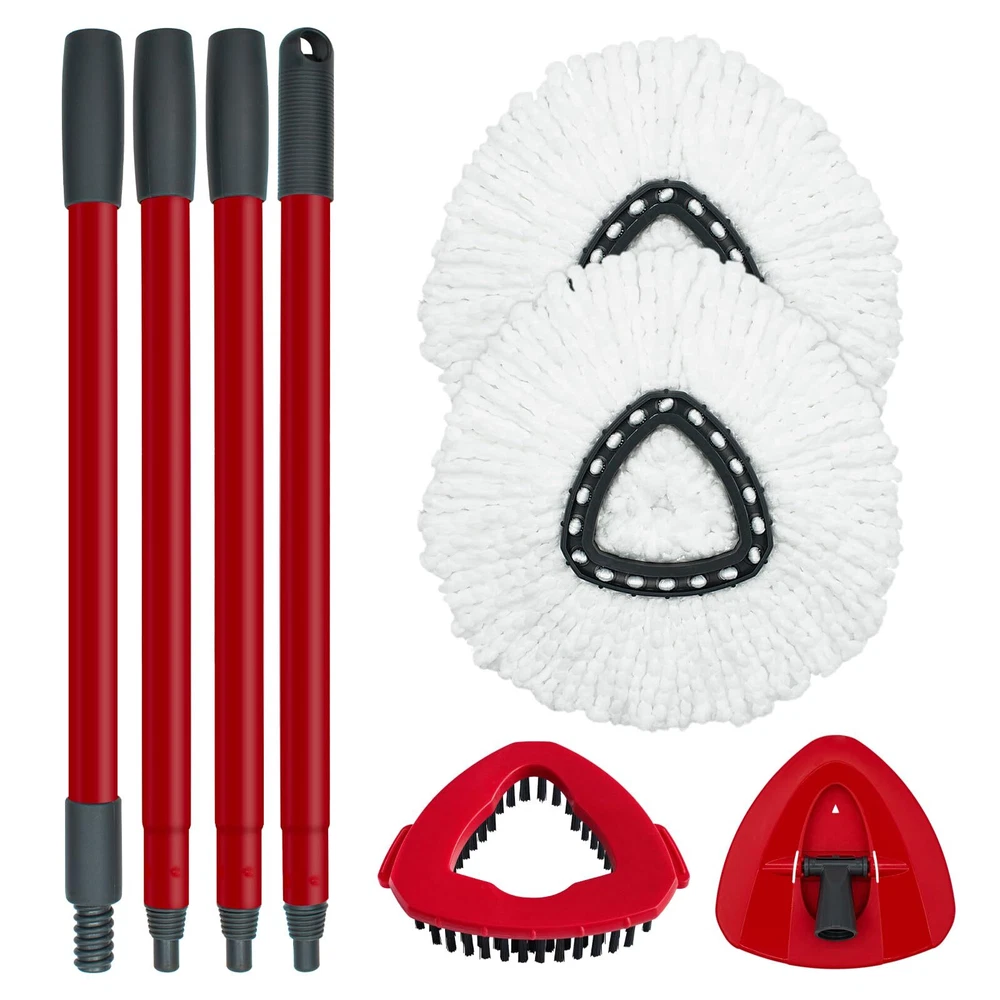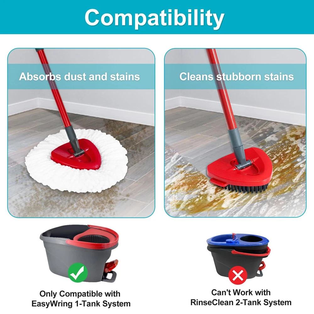 COMPATIBLITY: The spin mop replace heads, mop handle and mop base set is compatible with O-Ceda EasyWring Microfiber Spin Mop. NOTE: 2pcs mop heads replacements, scrubber mop head and base only compatible with 1-Tank system, NOT for RinseClean 2-Tank system. But the mop handle is universal fit for both 1 and 2 tank oceda spin mop system. DEEP-CLEANING MOP REFILLS: Our mop replacements are made with high-quality microfiber material that is super absorbent, perfect for wet and dry use, and wide application on various floor surfaces such as tile, bamboo, wood, ceramic, laminate, concrete, marble, and other sealed hard floors. Machine washable and reusable. STURDY AND DURABLE MOP HANDLE: Mop handle is made of high-quality iron material, it's more solid and durable than normal stainless mop handle, ensuring that will long-lasting to use. And the surface of the mop handle is treated with baked red paint process technology to ensure a firm grip when cleaning, preventing slips. ADJUSTABLE LENGTH MOP HANDLE: With an extendable length from 30" to 58", cedar mop stick can be easily adjusted to suit your height and cleaning needs. No need to bend over or squat while cleaning, making cleaning a breeze. TRIANGLE MOP BASE/SCRUBBER MOP HEAD: Designed with a rounded triangle shape, this mop head ensures your furniture stays protected while cleaning. The scrubber mop head reaches into tight spaces, grout lines, and hard-to-reach areas, making it perfect for cleaning tubs, tiles, around toilets, decking, and tough dirt on floor tiles.
