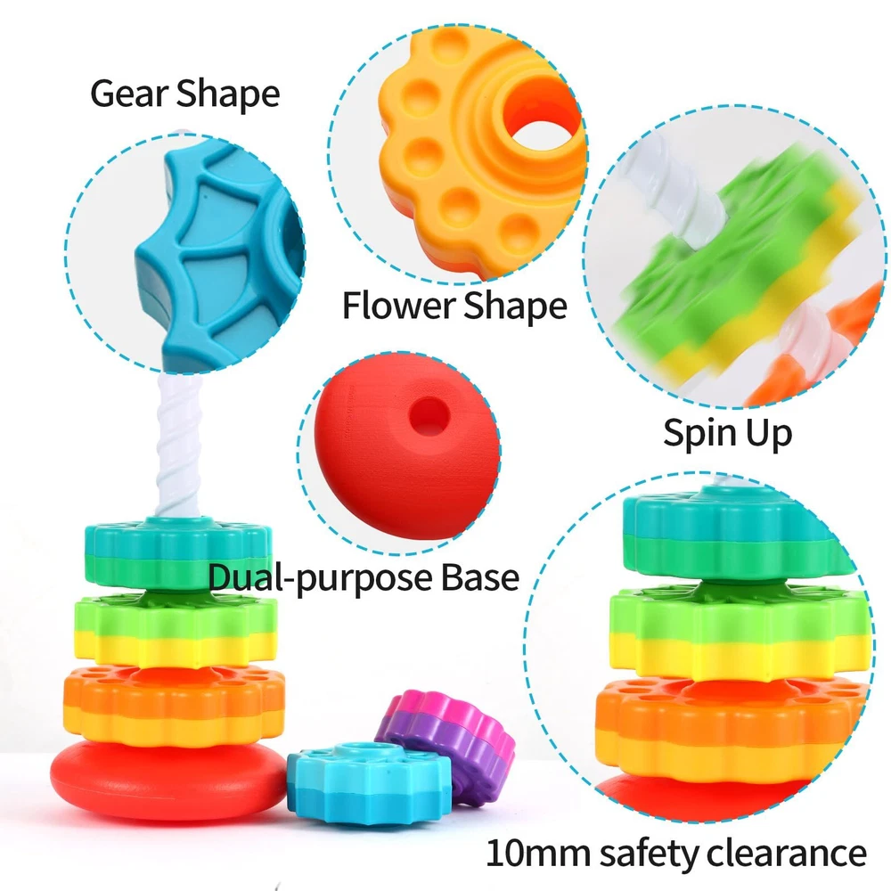 Tested - Rainbow Gears - Stackable Spinning Toy The Tested Rainbow Gears are an innovative educational toy designed to enhance your 's motor skills, hand-eye control, and problem solving abilities in a fun and engaging manner. This Regal Game makes for the perfect gift for children and new parents. It’s great for Easter baskets, Christmas, birthday parties, or baby showers! We encourage children to unleash their potential through play Little baby,use your creativity to stack everything you want!!! Hand-Eye Coordination Sorting, Color-Recognition Chunky Discs, Unique Textures – Inspires Tactile Exploration Spinning discs instill a sense of wonder Cause-and-Effect Learning Creative Play Easy for Little Hands to Grasp BPA-free – Exceptionally Safe 【Interesting stacking toys】Rainbow rotating tower is a new stacked science and education toy, which can accompany children's growth in innovative ways, enjoy happy times and help children stay away from screen addiction. 【Durable and Safe】The spin stacking toy is made of sturdy and durable ABS plastic, which is durable, comfortable to touch, BPA free, and passed the strict safety toy test to ensure your has a good play environment. 【Endless happy hour】Children can stack the discs by size, color, shape or random; when the stacking is complete, pull the pole off the base and watch all the discs slowly rotate and fall to the ground; flip to set the base to choose to shake or fix; Alternatively, you can hold the pole at both ends and let the disc spin up and down endlessly. 【Brain Development Learning】This spinning toy is not only fun, but also an excellent learning toy for little ones. Helps develop hand-eye coordination, cause-and-effect learning, dexterity and fine motor skills during play. Toddlers can also practice color recognition and tactile exploration. 【Best Gifts for Toddlers】This rainbow stacking toy is a Christmas, Thanksgiving or birthday gift for girls and boys ages 1 and up, it can be a great family activity to keep away from the screen while still Can have fun.