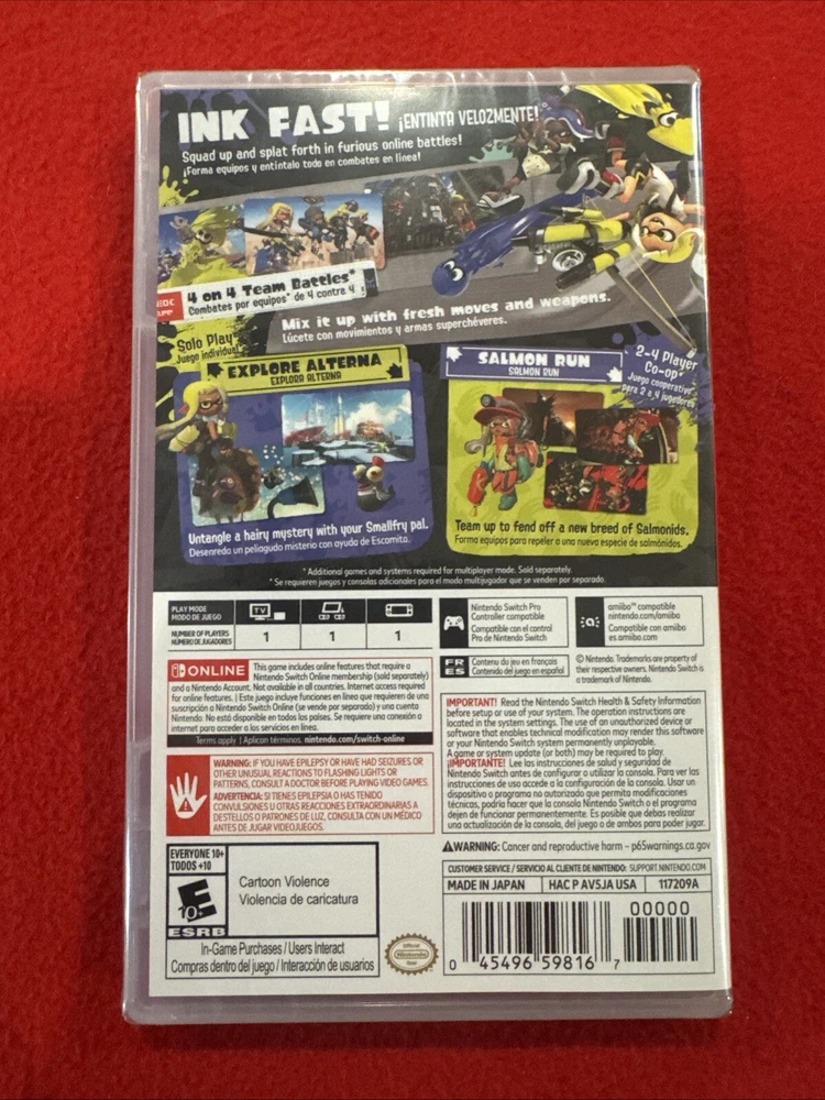 Experience the thrilling action and adventure of Splatoon 3 on your Nintendo Switch console. This game, released in 2022, is rated E10+ (Everyone 10+) and is the perfect addition to your video game collection. With its NTSC-U/C (US/Canada) region code and factory-sealed packaging, you can be sure that you are getting a high-quality gaming experience. Immerse yourself in the world of Splatoon 3, the latest addition to the popular game franchise from Nintendo Games. This game, which is set in the United States, is sure to provide hours of entertainment for players of all ages. Don't miss out on this opportunity to own a copy of Splatoon 3 for your Nintendo Switch console.