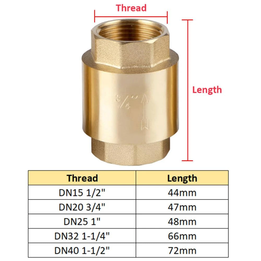Features: 1. Made of high quality brass, sturdy and durable for long term use. 2. With good resistance to corrosion and oxidation. 3. Good sealing capability prevents the fluid from leaking. 4. 5 sizes standardized thread, suitable for most pipeline system. 5. Mainly used in the pipelines of petroleum, chemical, pharmacy, fertilizer, electricit. Specifications Material : Brass,Stainless Steel Thread size:1/2"(18.5mm), 3/4"(24mm), 1"(30mm), 1 1/4"(39mm), 1 1/2"(45mm) Color:Gold Working temperature:-10℃≤ t ≤120℃ Instructions: 1. The check valve should be installed on the horizontal pipeline. The vertical check valve should be installed on the vertical pipeline, and the medium flows from bottom to top. 2. The swing check valve installation position is not limited, it is usually installed on the horizontal pipeline, and can also be installed on the vertical pipeline and on the inclined pipeline. 3. When installing, please pay attention to the flow direction of the medium should be consistent with the arrow shown on the valve body. Package Content: 1 x Check Valve 【High quality】Made of high quality brass, is durable, can be used for a long time, and has a long service life 【Stability energy】The In-line Check automatic valve is made of brass and stainless steel, with surface precision treatment, good corrosion resistance and high pressure 【Good sealing】This type of valve is good to prevent liquid leakage, should be installed horizontally during installation, allowing only the medium to flow in one direction to prevent accidents 【Wide application】Applicable for water, steam, oils, nitric acid, urea and more. Mainly used in the pipelines of petroleum, chemical, pharmacy, fertilizer, electricity 【Package contant】1pcs Non Return Check Valve