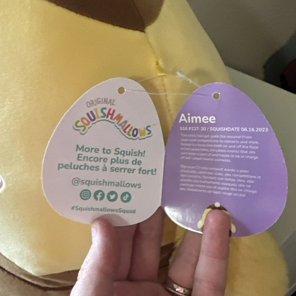 This plush is unbelievably soft and huggable—it's like snuggling a cloud! Aimee's cute chick design and vibrant colors make her irresistible. Perfect for kids or collectors, she's great for stress relief or just adding a pop of joy to your space. High-quality materials ensure she stays cuddly wash after wash. A must-have for any Squishmallows fan! So squishy and fun, you’ll want one in every size.