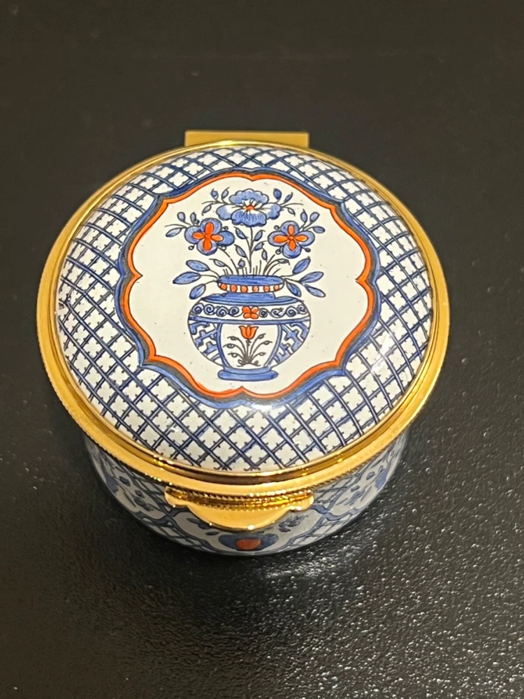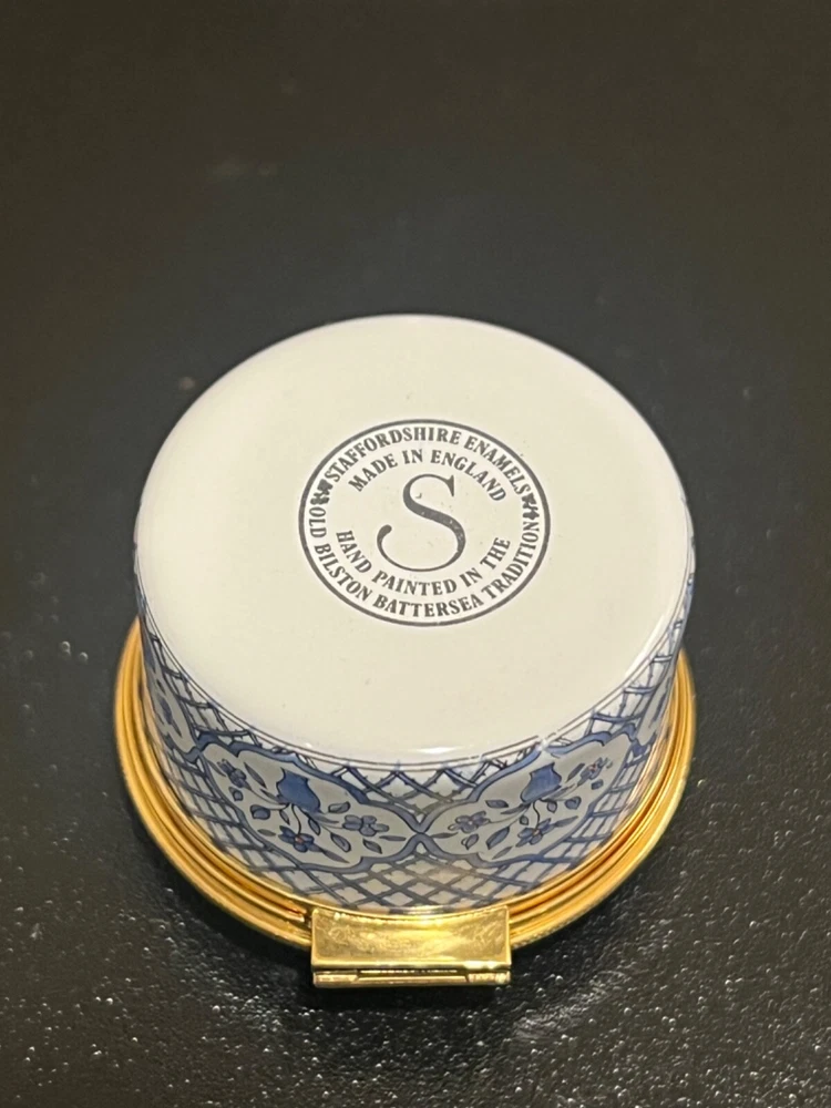 This is a stunning pill box from the Staffordshire Enamels brand, featuring a beautiful flower pattern on a round, small-sized box. The box is painted with multicolor enamel and depicts a boxing subject in a traditional style. This trinket box is hand-painted and has a pre-1800 time period manufacture from the United Kingdom. It is a collectible item from the Halcyon Days collection and is finished with a painted look. Perfect for collectors and enthusiasts of traditional decor, this 18th century treasure is a must-have.