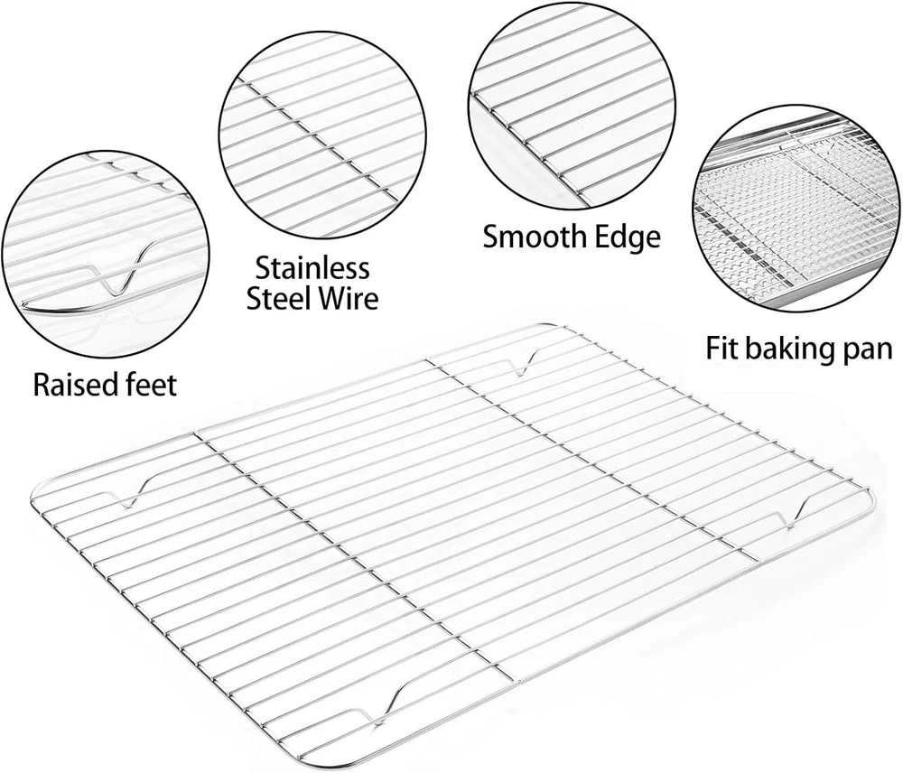 VERSATILE BAKING KIT: Pack of 9 in 3 different sizes 15.9 x 12 x 1 inch, 12.4 x 9.6 x 1 inch, and 10.4 x 8.1 x 1 inch- This oven cooking set includes 3 rimmed baking sheets, 3 cooling racks and 3 silicone baking mats, fits most regular toaster ovens PREMIUM MATERIAL: The baking sheet pans and cooling racks are made of premium pure stainless steel, rust and warp resistant. The non-stick baking mats are made of premium silicone and reinforced fiberglass, can withstand temperatures ranging from -40°F to up to 500°F, scratch resistant and dishwasher friendly SUPERIOR CRAFT: Our stainless steel cookie sheets are highly mirror polished to reduce the risk of food sticking and to release food easily; Smooth roll rims make it comfortable to hold. Each stainless steel rack with tight grid has four raised feet, keeping meat lifted above juice and easily release. With dense parallel lines, keep food from falling. Each roasting rack and baking mat fits in the baking pans EASY TO CLEAN: Deep full sides all around the baking sheet pans prevent juice from the food on the rack from flowing everywhere to keep your oven totally neat. These baking tools are all easy to clean even by hand-washing and dishwasher friendly; wash with warm water, mild soap and gentle sponge. This set is packaged together in a box, great for your favorite home chef, newlywed or yourself MULTI-USE MEET YOUR NEEDS: Great for baking bacon, crispy chicken, bread, pastries, cookies, brownies, fruit cobblers making, cooling cookies and cakes and draining water and oil, also meet most of your daily oven pans needs. Enjoy a easier and happier baking time Product Description MCIRCO 9Pcs stainless steel baking sheet set A great helper for your baking. ALL-IN-ONE SET Package includes 3 baking sheets, 3 cooling racks and 3 baking mats in 3 different sizes. Work well for baking, roasting, grilling, cooling, drying and so on. Stainless Steel Smooth edges Mirror finish Easy to clean Deep Rim Non-stick mats Premium Baking Set Great Addition To Your Kitchen No more aluminum into your food, great replacement to aluminum pan. The baking sheet and rack are made of premium pure stainless steel. Our stainless steel baking sheet has superior mirror finish to reduce the risk of food sticking; Smooth roll edges make it comfortable to transfer. Deep full sides all around prevent food juice from flowing everywhere to keep your oven neat. Please clean and dry the baking pan and cooling rack after using it. Please clean the trays with soft cleaning rag, prevent scratching the surface. Mirror Finish The sturdy mirror construction of baking sheet pans provides superior heat conductivity, make it easy to release baked goods and easy to clean. Smooth Edges All edges of the sheet pans and racks are polished to be smooth without rough spot, make it super comfortable to transfer. Non-stick Mats 3 baking silicone baking mats are non-stick, oven-safe up to 480 degrees, great for thousands of uses, easy to clean. Versatile Use Ideal for baking bacon, crispy chicken, cinnamon rolls, bread, cookies, brownies, fruit cobblers, cooling cookies and cakes and draining water and oil.