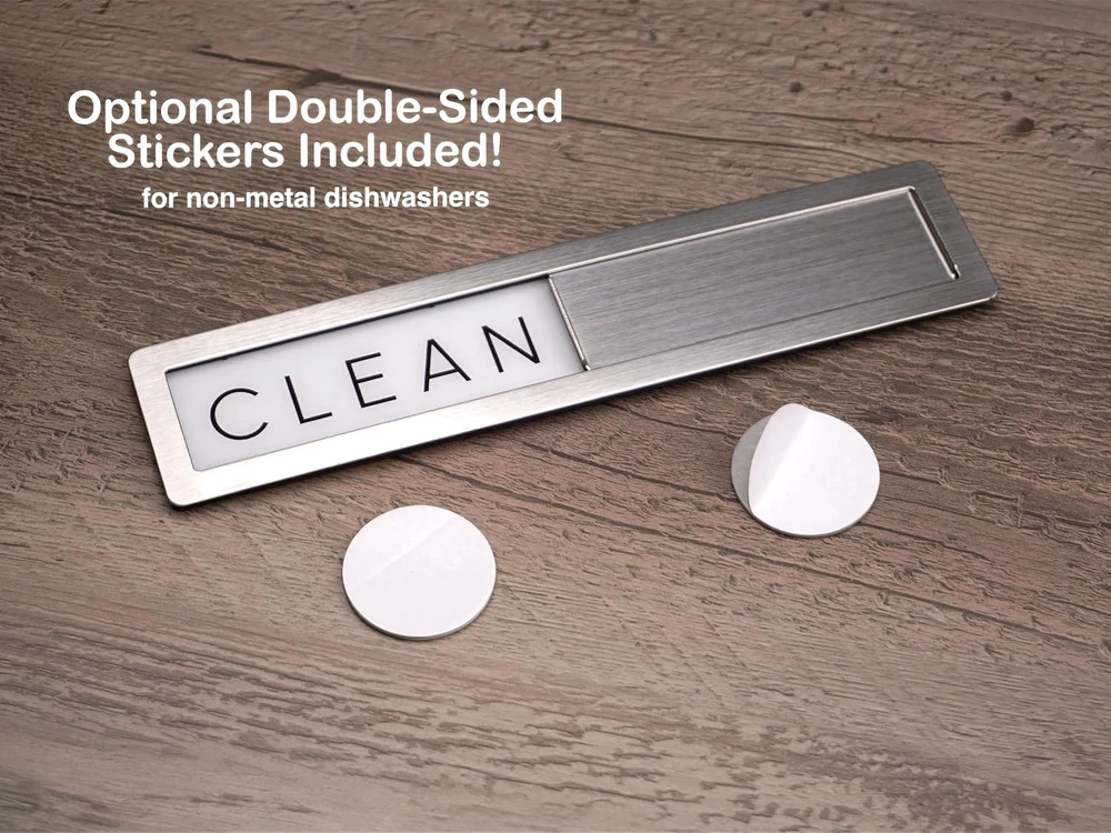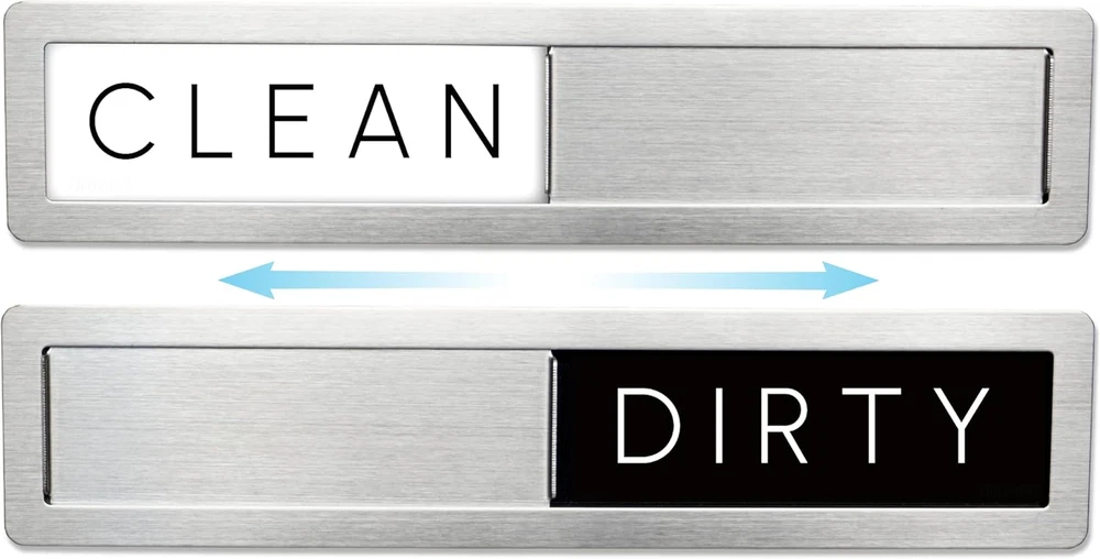 Dual Functionality: Clearly indicates whether dishes inside the dishwasher are clean or dirty with "Clean" and "Dirty" labels. Premium Material: Made of 304 stainless steel, known for its corrosion resistance, making it ideal for kitchen environments with frequent water exposure. Perfect Size: Measures 7.125 by 1.625 inches, ensuring easy readability without occupying too much space. User-Friendly Design: Features a steel sliding door with raised handles for effortless switching between "Clean" and "Dirty" indicators. Simple & Minimal: "Clean" side features a white background, and "Dirty" side has a black background for clear differentiation. Minimalistic Design: The words "Clean" and "Dirty" are in a minimalistic typeface, blending seamlessly with any kitchen decor. Durable Construction: High-quality metal build ensures long-lasting use without wear and tear. Perfect Gift: Comes with 2 double-sided sticker adhesives for non magnetic surfaces packaged in a giftable box. Product Description FridayVibez Premium Stainless Steel Clean/Dirty Dishwasher Magnet The video showcases the product in use. The video guides you through product setup. The video compares multiple products. The video shows the product being unpacked. The answer is clear. Sleek & Modern Like It Came With Your Dishwasher Upgrade your kitchen with our sleek and functional stainless steel. This innovative magnet clearly indicates whether your dishes are clean or dirty, making household chores more efficient. Crafted from premium 304 stainless steel, this magnet is designed to withstand the rigors of a busy kitchen, offering superior resistance to corrosion and water damage. Crafted from 304 Grade Steel Minimalistic Design and User-Friendly Its user-friendly design features a steel sliding door with raised handles, allowing you to effortlessly switch between the "Clean" and "Dirty" indicators. Both sides boast a very minimalistic touch, harmonizing with the entire stainless steel casing for a modern and sophisticated look. The edges of the magnet are smooth and safe, making it ideal for households with children, as it won’t cut their fingers during use. Magnetic Surfaces Or Not Compatible with appliances that look like metal... but aren't. The package includes two adhesive tapes for non-magnetic dishwasher doors, allowing you to easily attach the Stainless Steel Dishwasher Magnet. Just apply the tape to the back of the magnet and press it firmly onto the dishwasher door. These tapes let you enjoy the sleek look of our Stainless Steel Dishwasher Magnet on any type of dishwasher. Easy to Read, Loud & Clear Minimal font that can be read easily. Measuring 7.125 by 1.625 inches, this dishwasher magnet is perfectly sized for easy readability without being obtrusive. The minimalistic typeface used for the "Clean" and "Dirty" labels ensures that this magnet will complement any kitchen decor. Whether your style is contemporary or classic, this dishwasher magnet will seamlessly blend in, adding a touch of elegance to your appliances. Check Out Our Premium Styles! Add to Cart Add to Cart Add to Cart Add to Cart Customer Reviews 4.9 out of 5 stars 377 4.9 out of 5 stars 377 4.9 out of 5 stars 377 4.9 out of 5 stars 1,436 Price $16.99 $ 16 . 99 $16.99 $ 16 . 99 $16.99 $ 16 . 99 $9.99 $ 9 . 99 Trendy Design ✔ ✔ ✔ ✔ Includes Adhesives ✔ ✔ ✔ ✔ Super Strong Magnet ✔ ✔ ✔ ✔ Premium Quality ✔ ✔ ✔ ✔ Trusted US Brand ✔ ✔ ✔ ✔